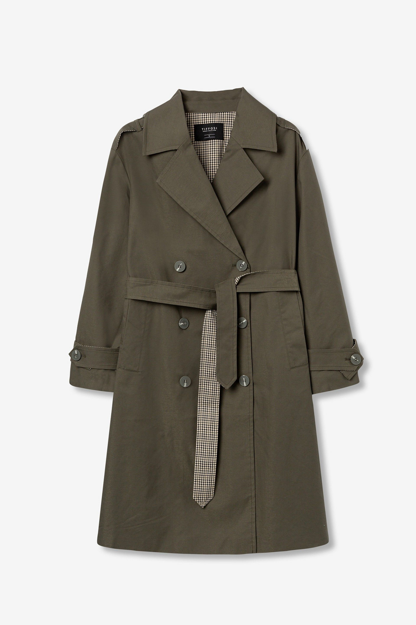 Gabardina larga color verde con detalle de cuadro Vichy en tonos verdes, marrón y beige en el reverso del cuello ,cinturón, solapa y mangas. Abotonada por delante. Bolsillos laterales.
