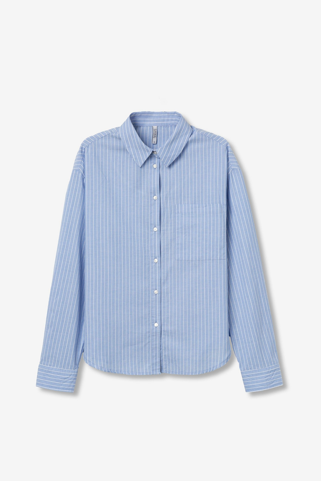 Camisa azul de manga larga con rayas blancas, corte relajado y bolsillo frontal discreto.100% COTTON