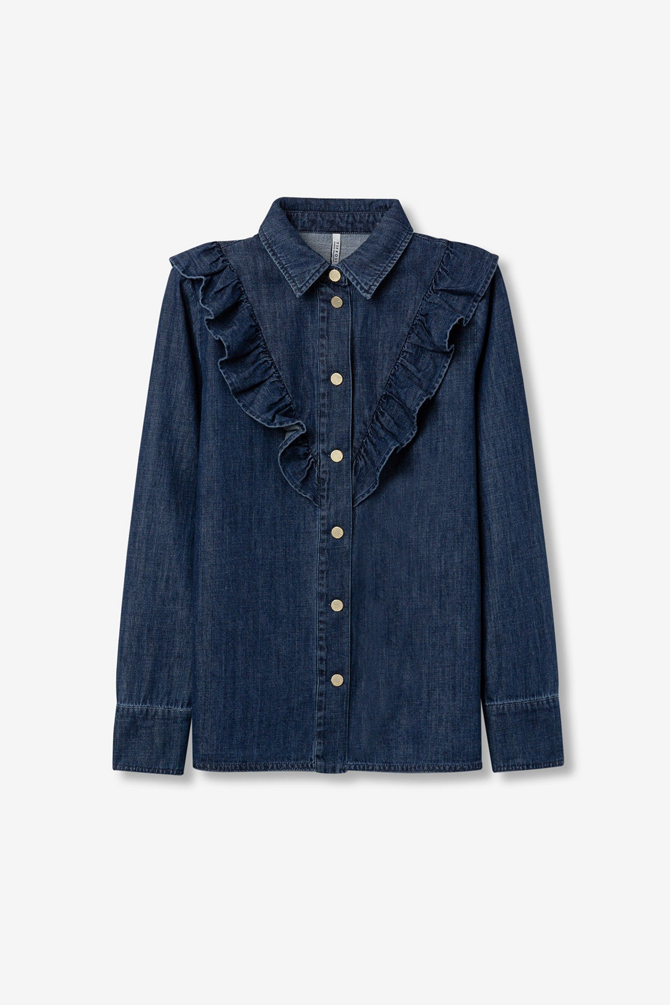 Camisa denim con detalle de volante en la solapa. Cierre con botones plateados en el frontal. Detalle de botón plateado en el puño.