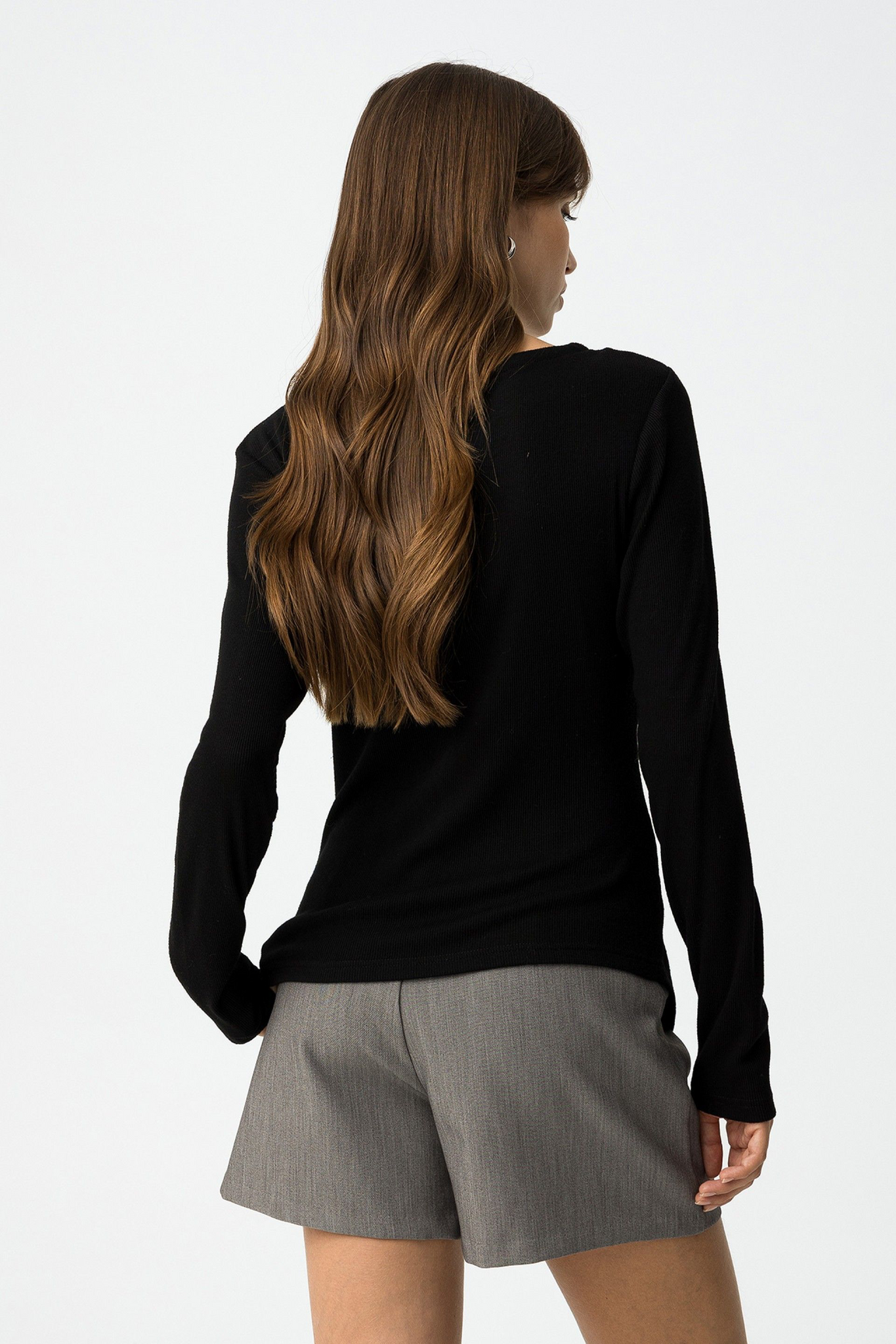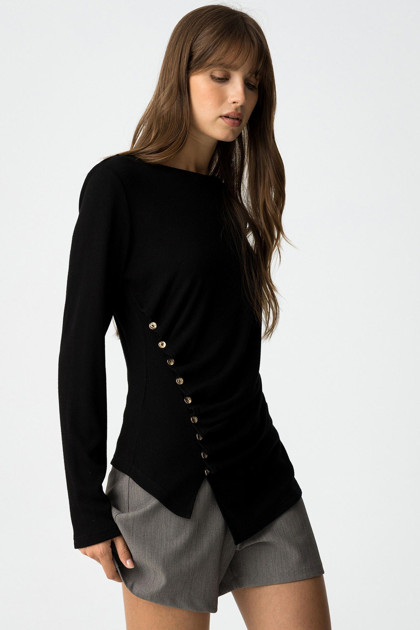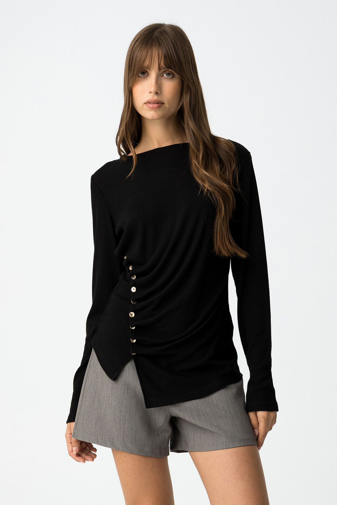Camiseta slim fit de punto canalé, con fruncido asimétrico y botones metálicos decorativos. Cuello redondo y manga larga.