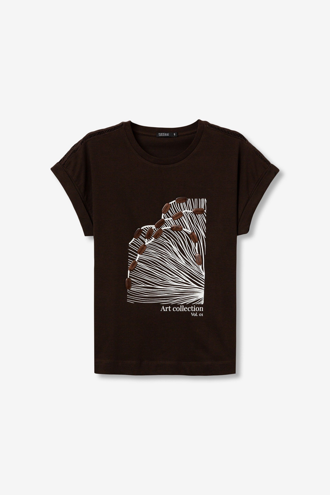 Camiseta chocolate de corte regular, manga corta y estampado floral oscuro en la parte delantera.