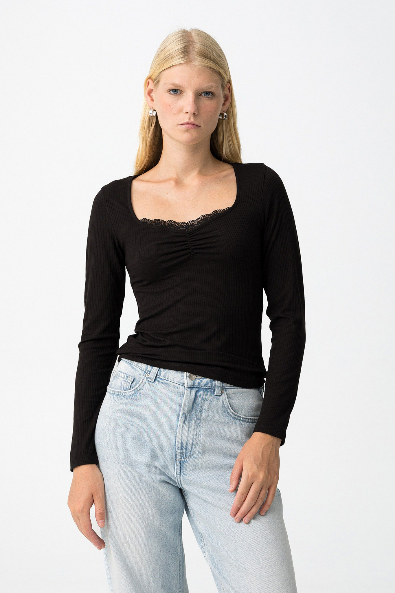 Camiseta de manga larga fina de canalé. Escote con fruncido y encaje. Color negro.