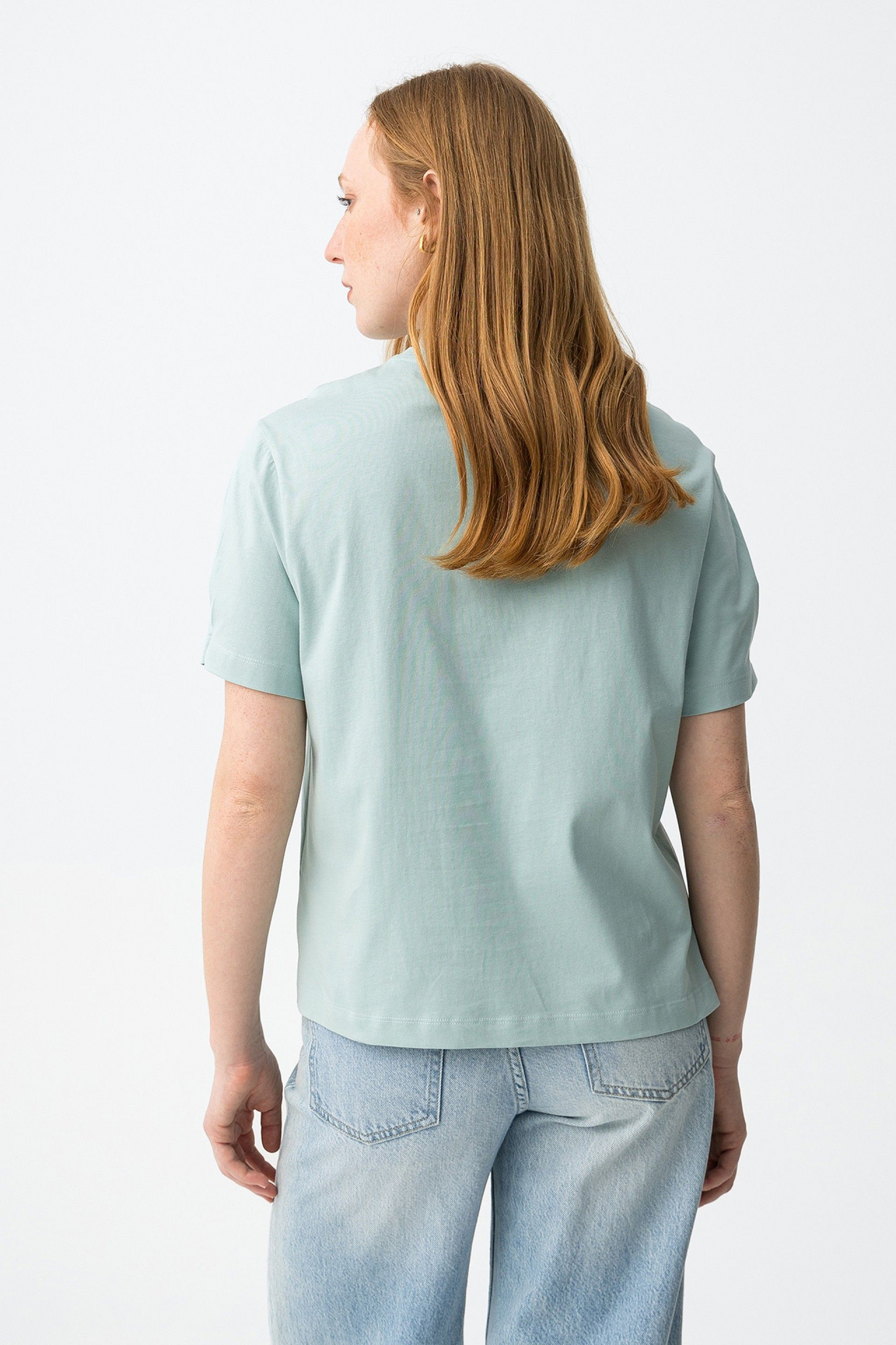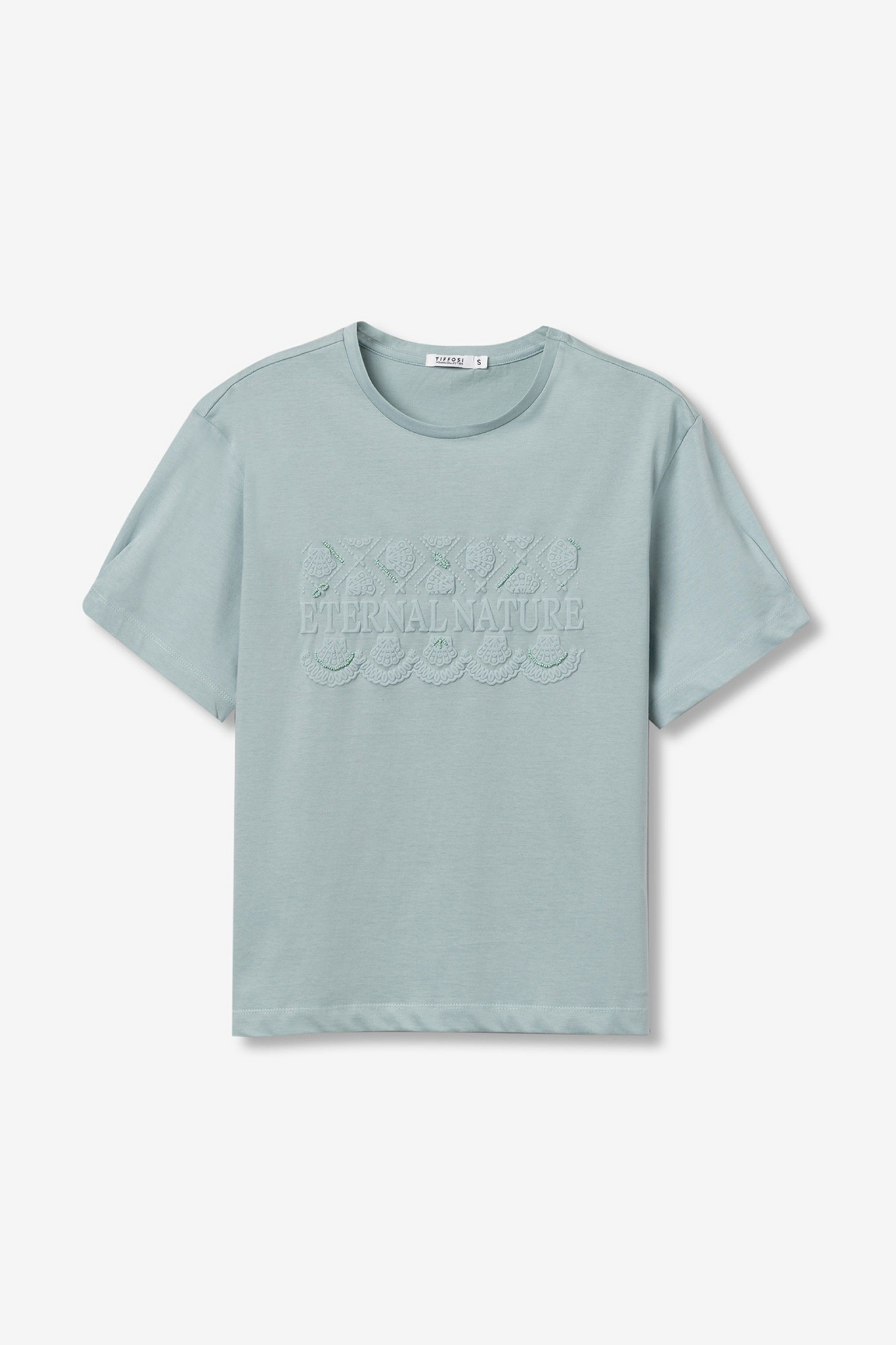Camiseta de manga corta en verde claro, corte relaxed, con bordado frontal y cuello redondo clásico.100% COTTON