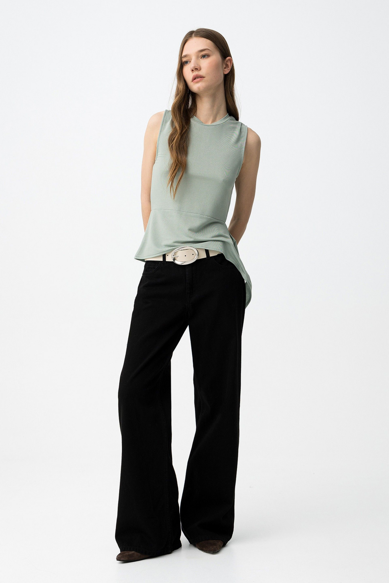 Top slim sin mangas en verde claro, con aberturas laterales y bajo asimétrico moderno.92% VISCOSE 8% ELASTANE