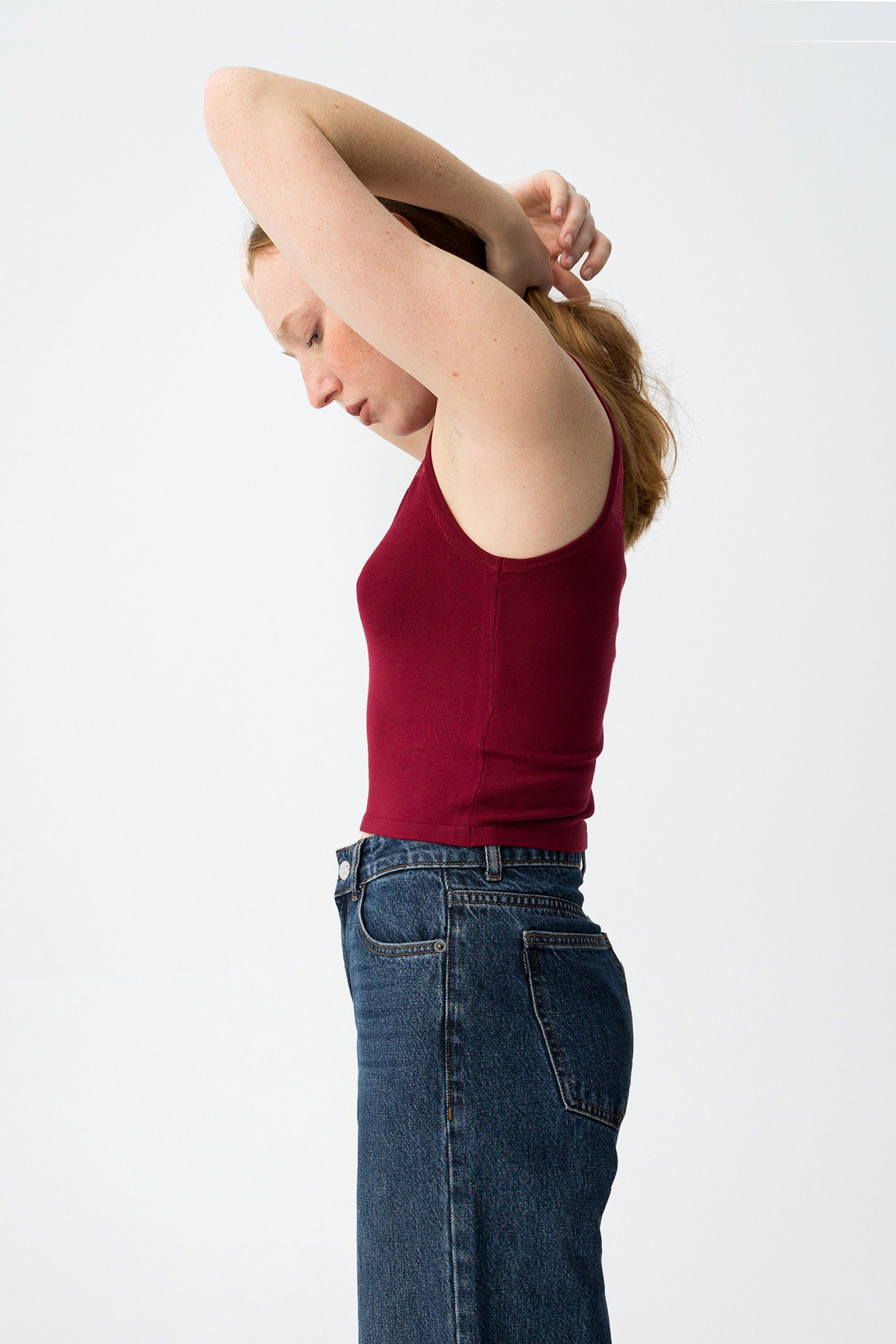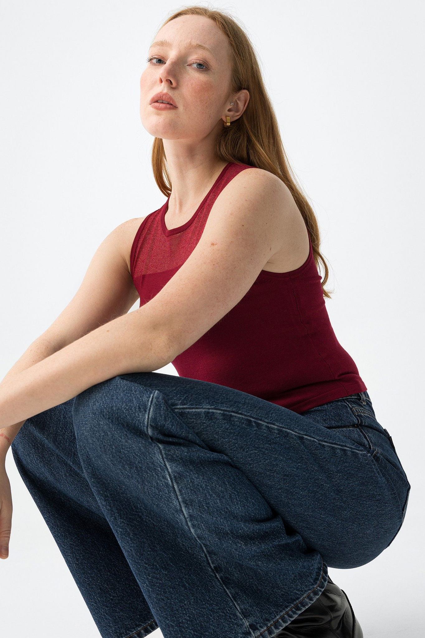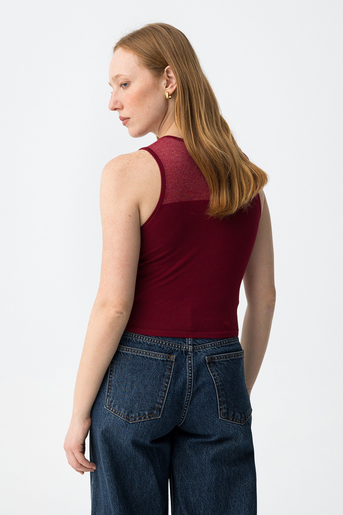Top ajustado de punto en color burdeos, detalle transparente en el pecho, corte minimalista y actual.