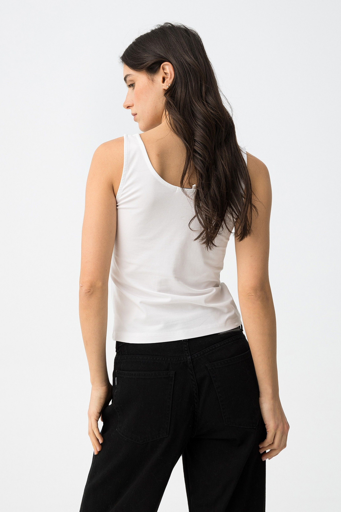 Top de color blanco, corte super slim, tirantes anchos y detalle minimalista en el pecho.