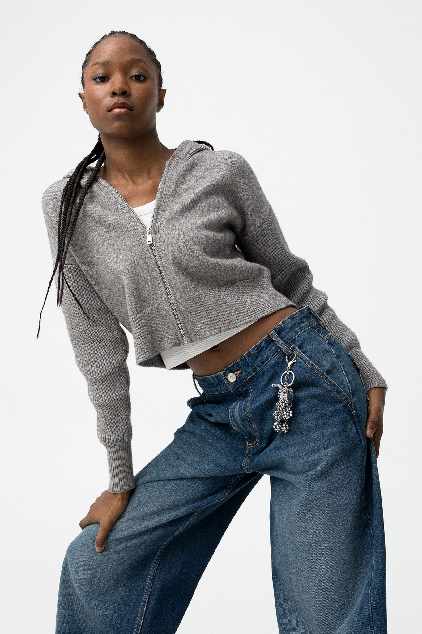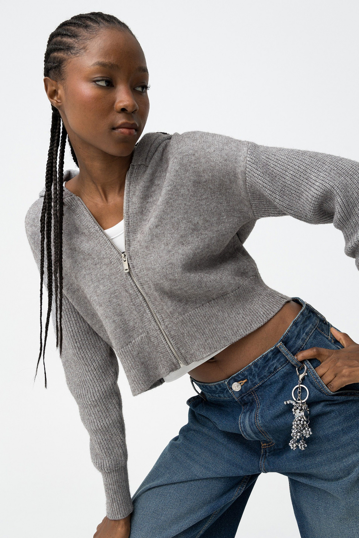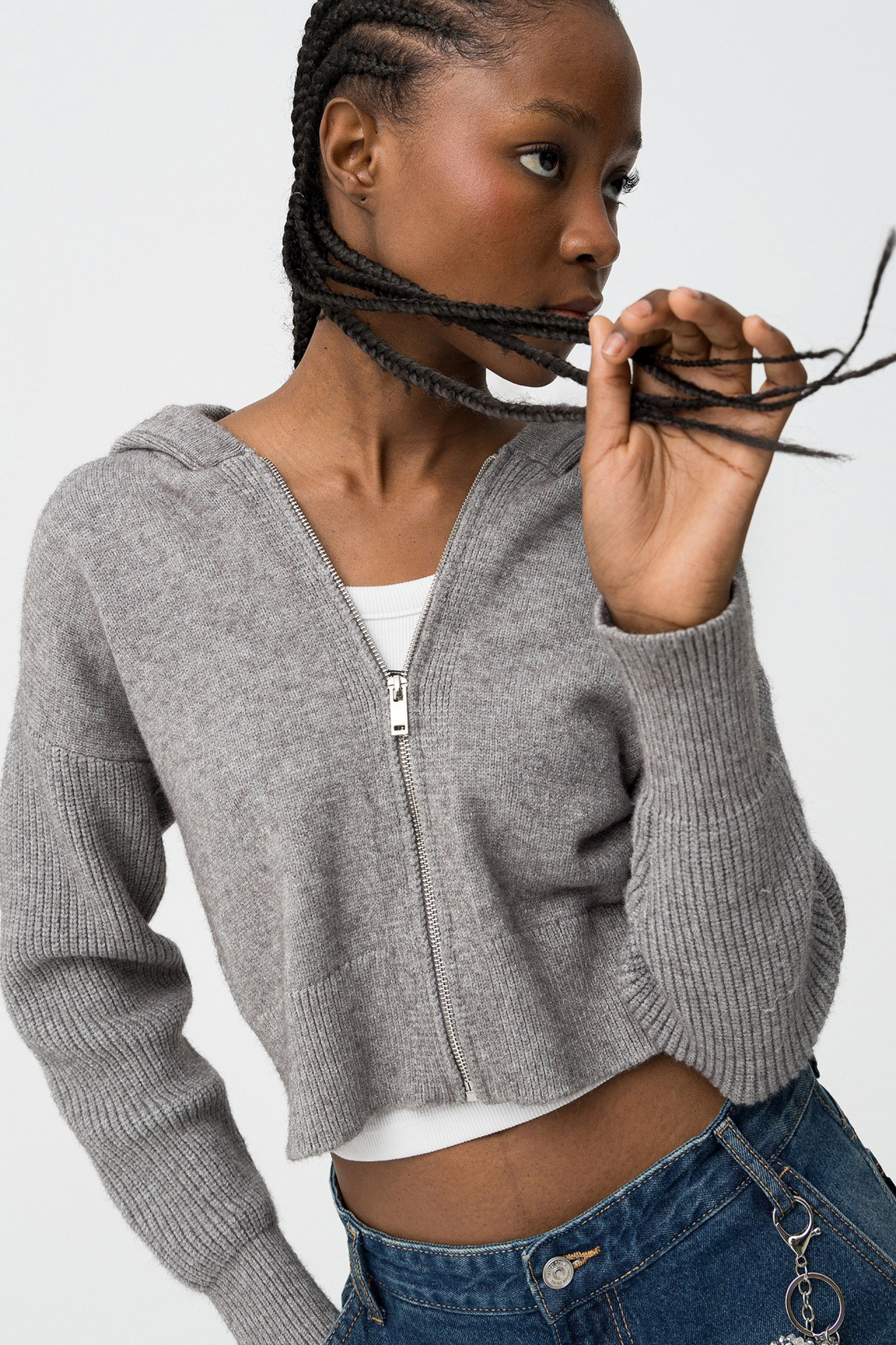 Cárdigan relaxed fit con capucha, cierre de cremallera, manga larga y bajo cropped.