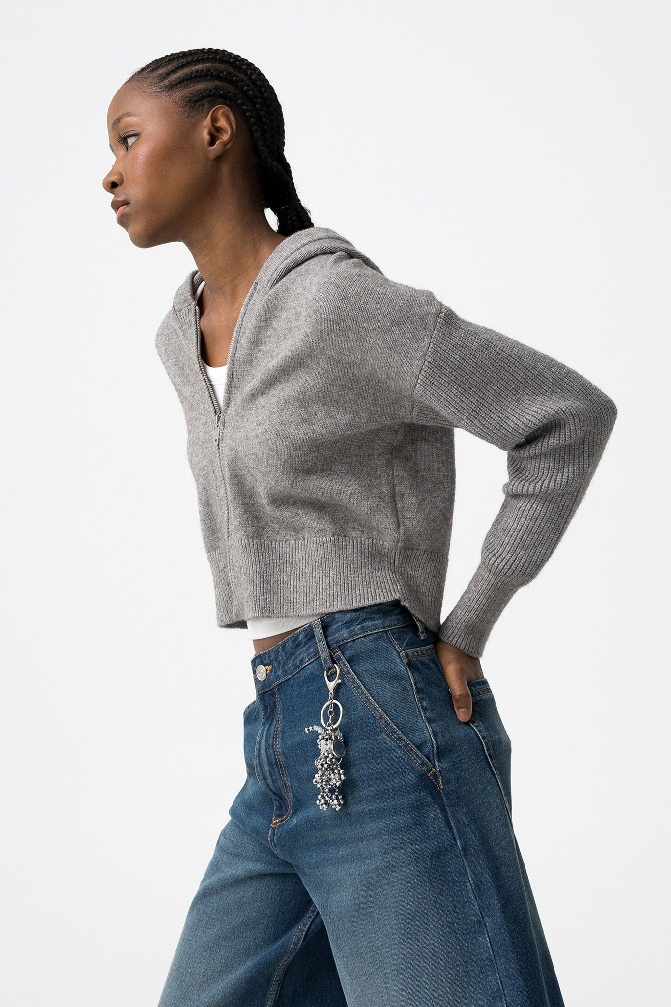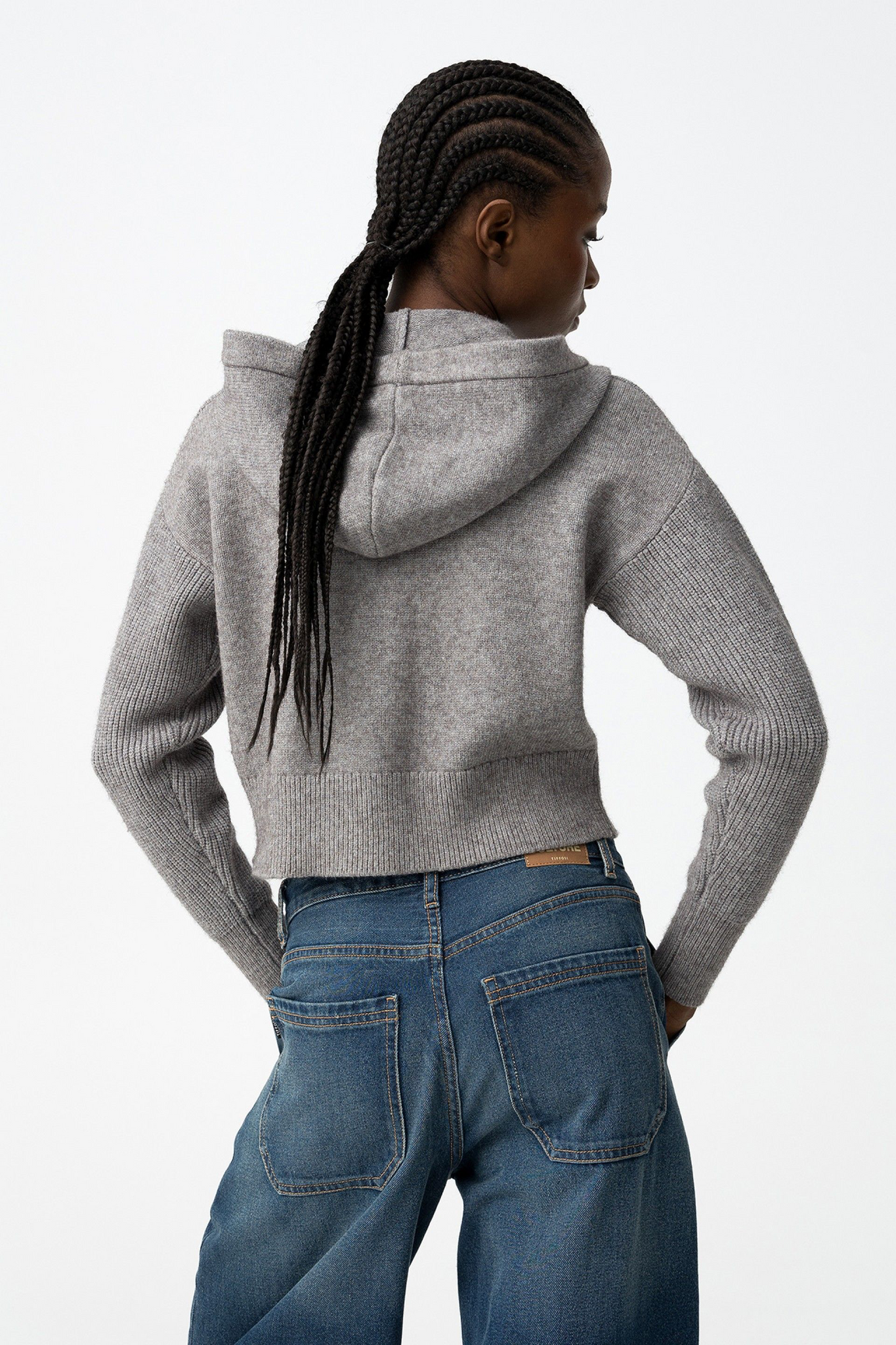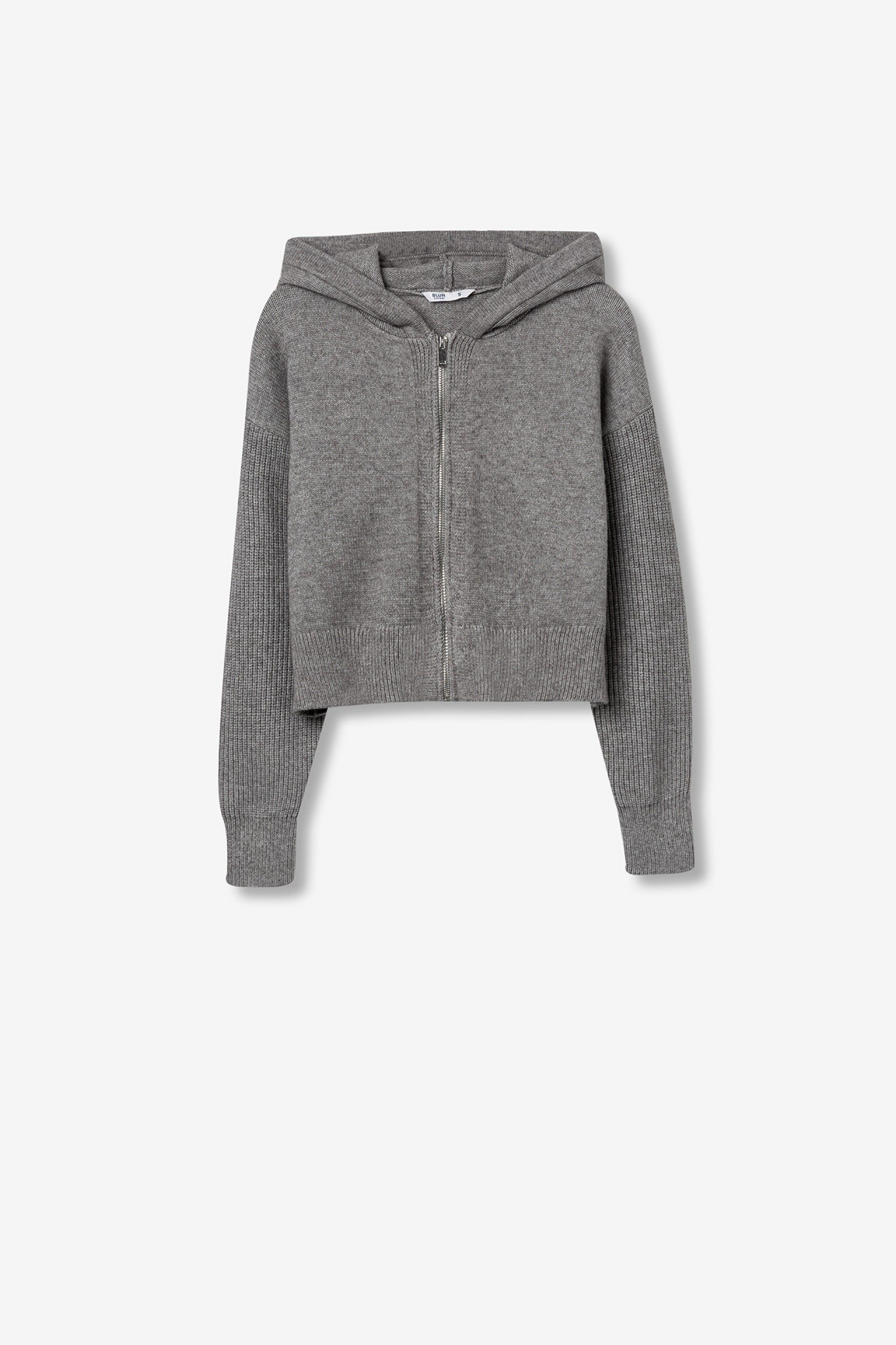 Cárdigan relaxed fit con capucha, cierre de cremallera, manga larga y bajo cropped.