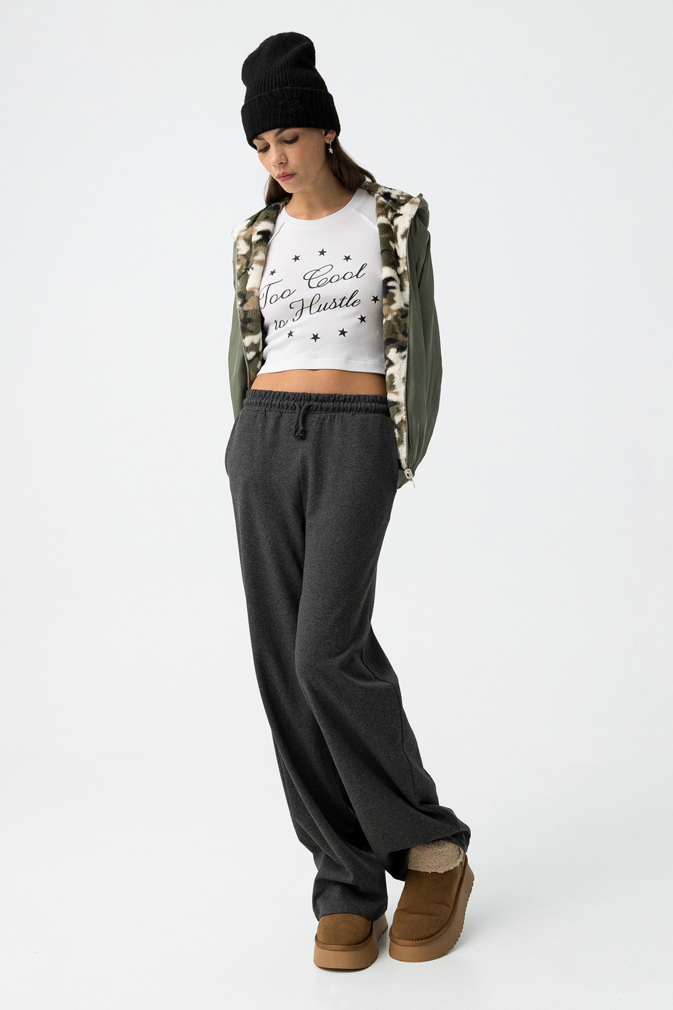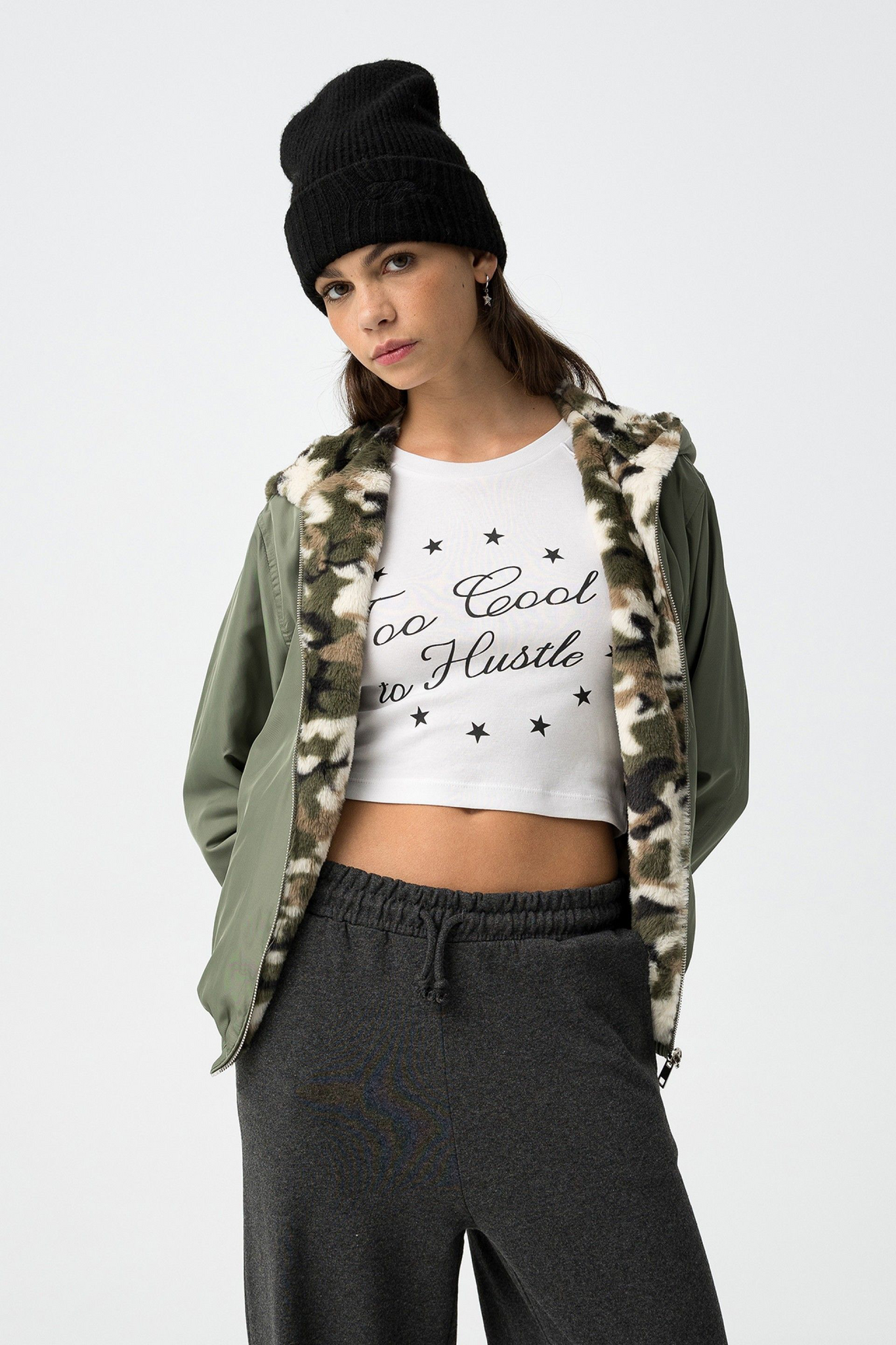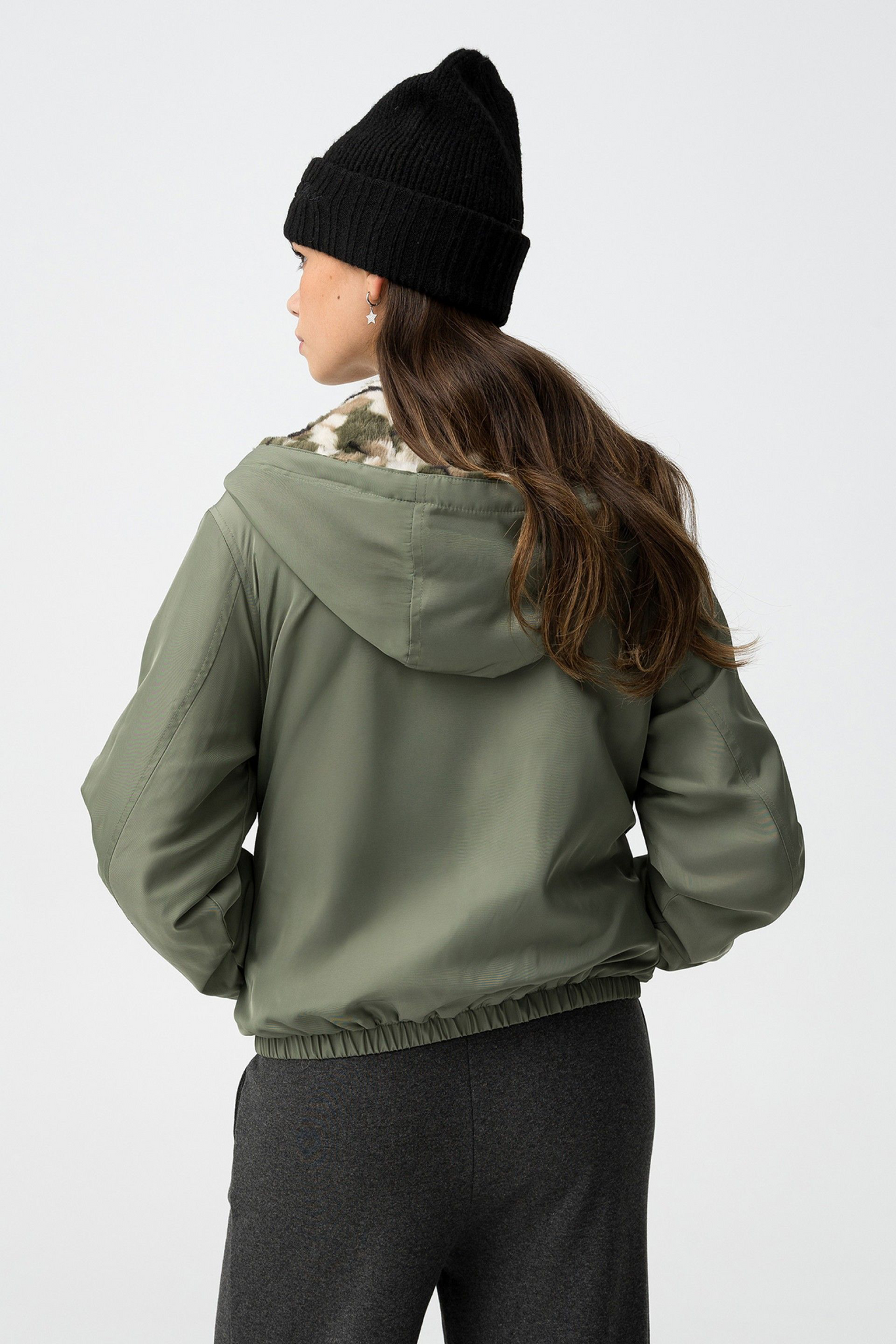 Chaqueta relaxed fit con capucha. Cierre frontal de cremallera. Bolsillos laterales y ajuste de cintura con cordón. Reversible: un lado en tejido liso y otro e