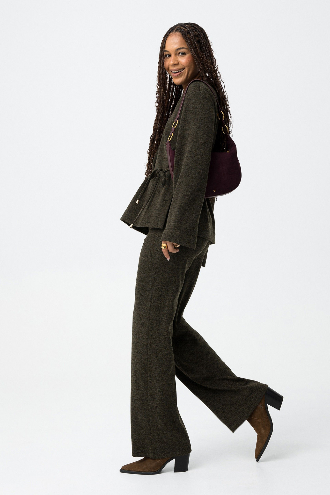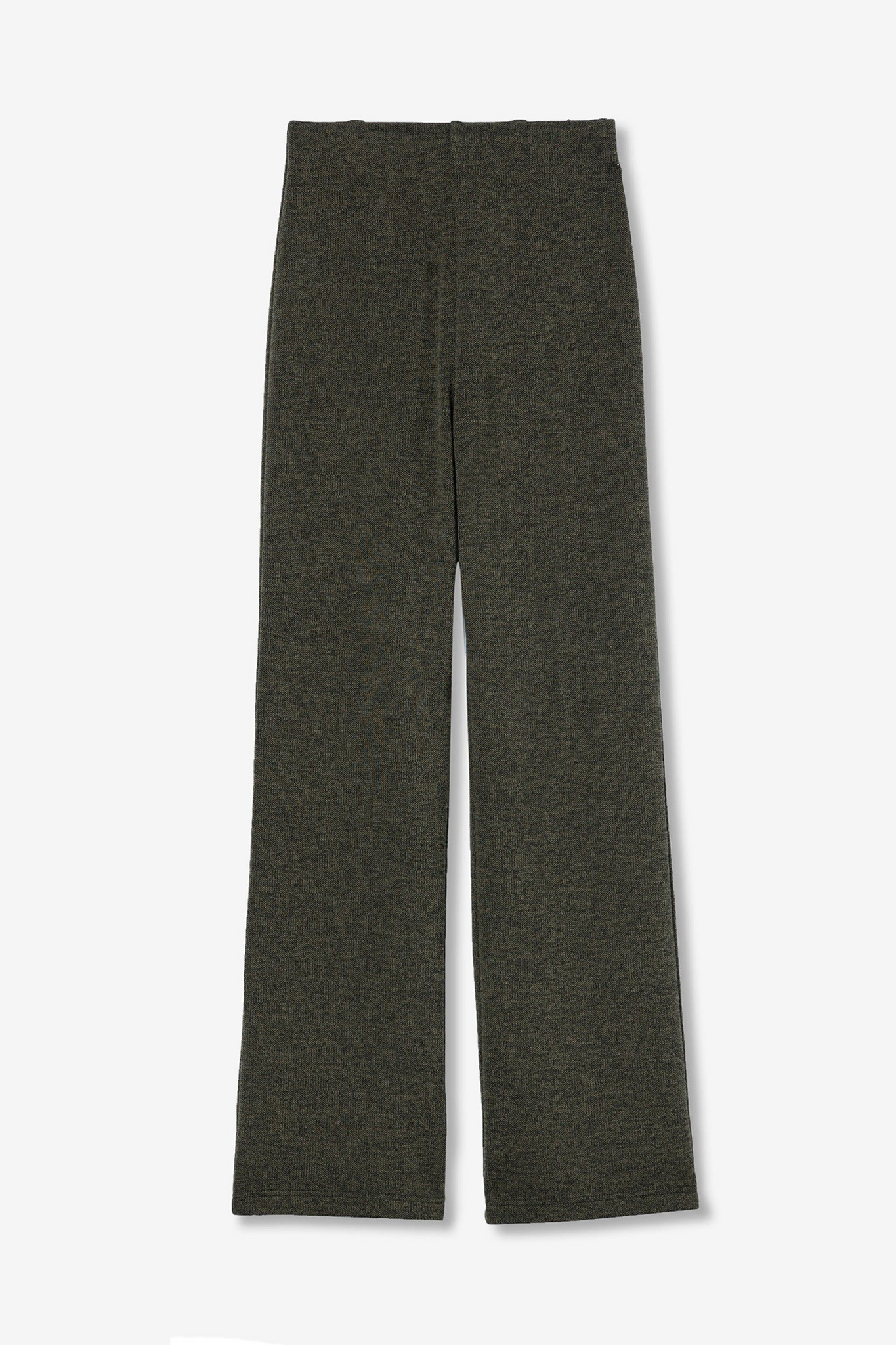 Pantalones de corte recto en verde oscuro, cintura alta y tejido fluido, estilo elegante.