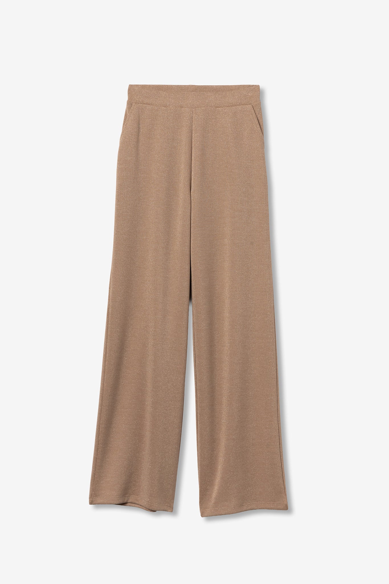 Pantalón beige de tiro alto, corte ancho, tejido texturizado y bolsillos laterales, rollo minimalista.