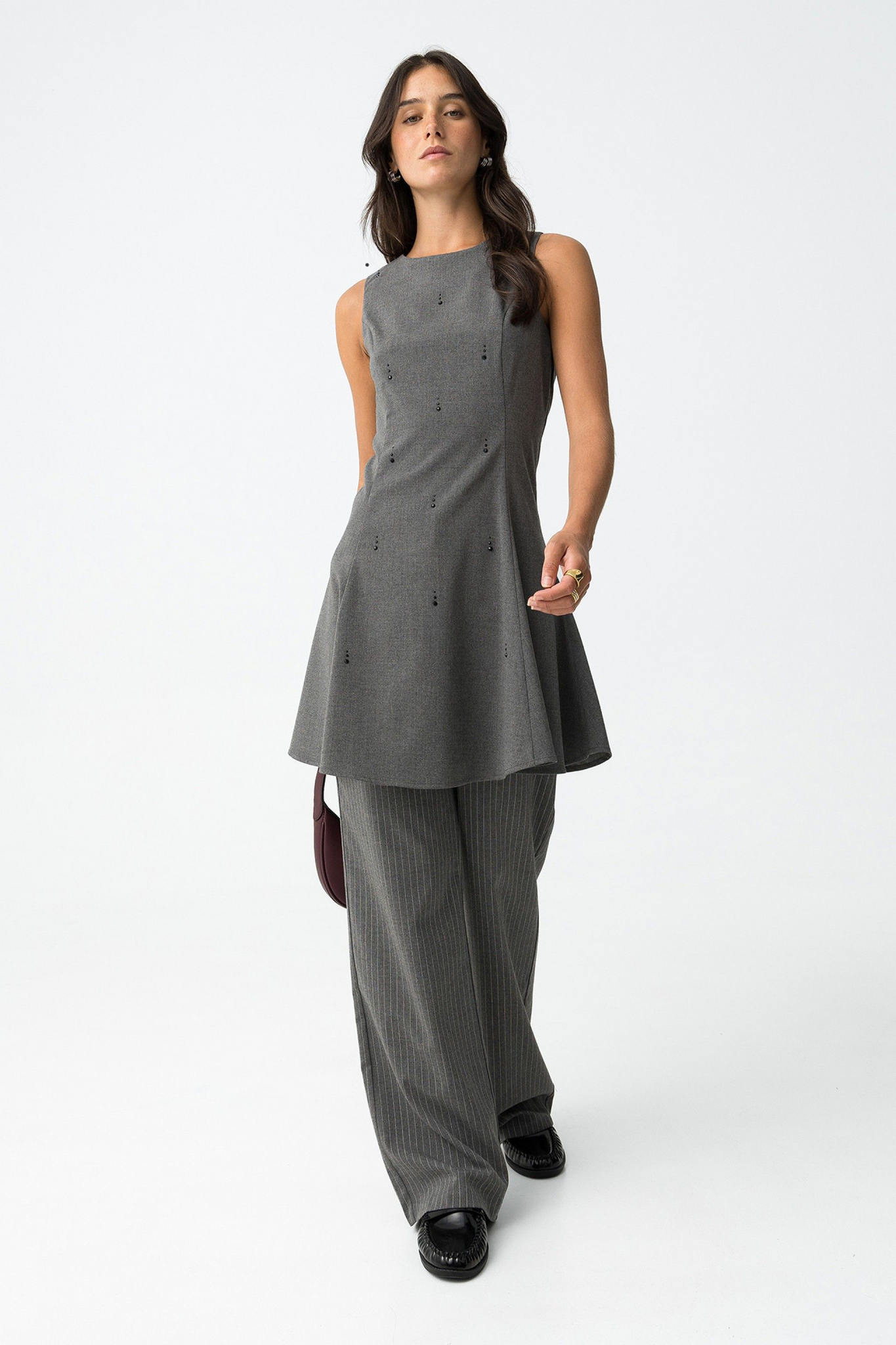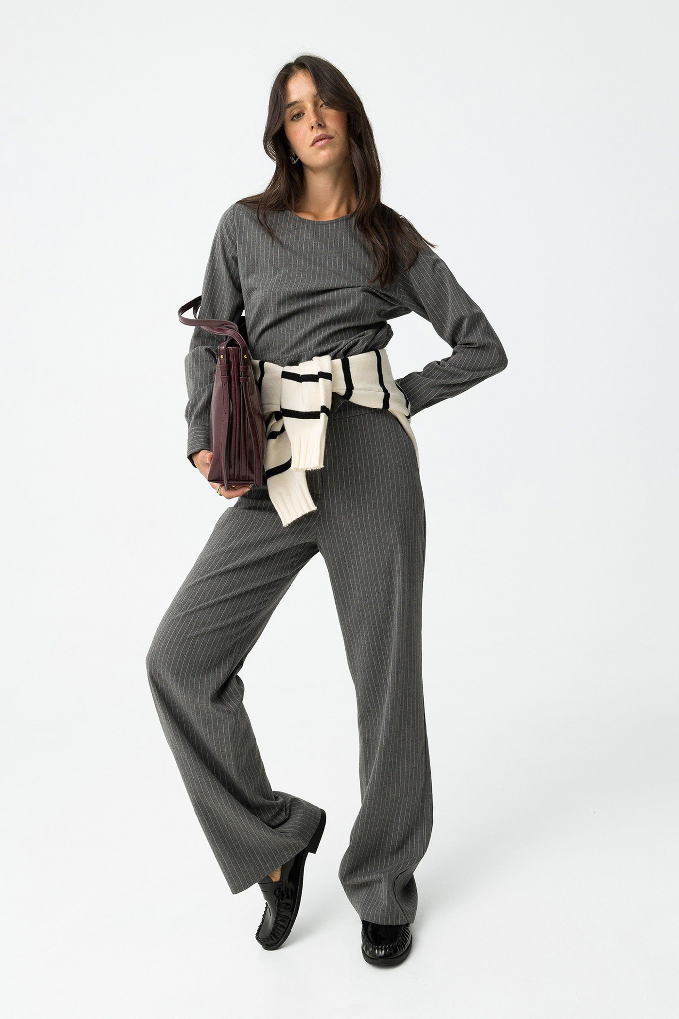 Pantalón de traje color gris con raya diplomática . Cierre con botón y cremallera. Bolsillos laterales.