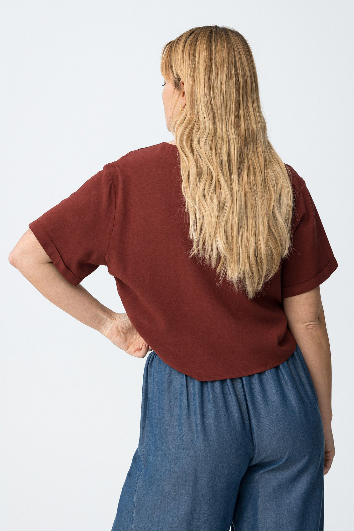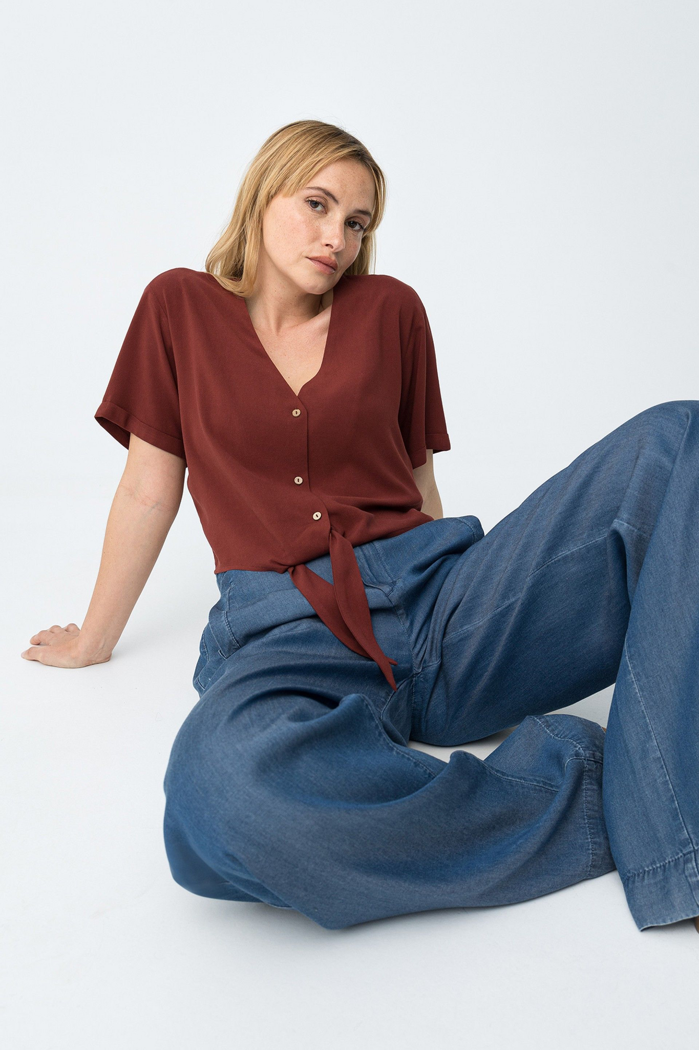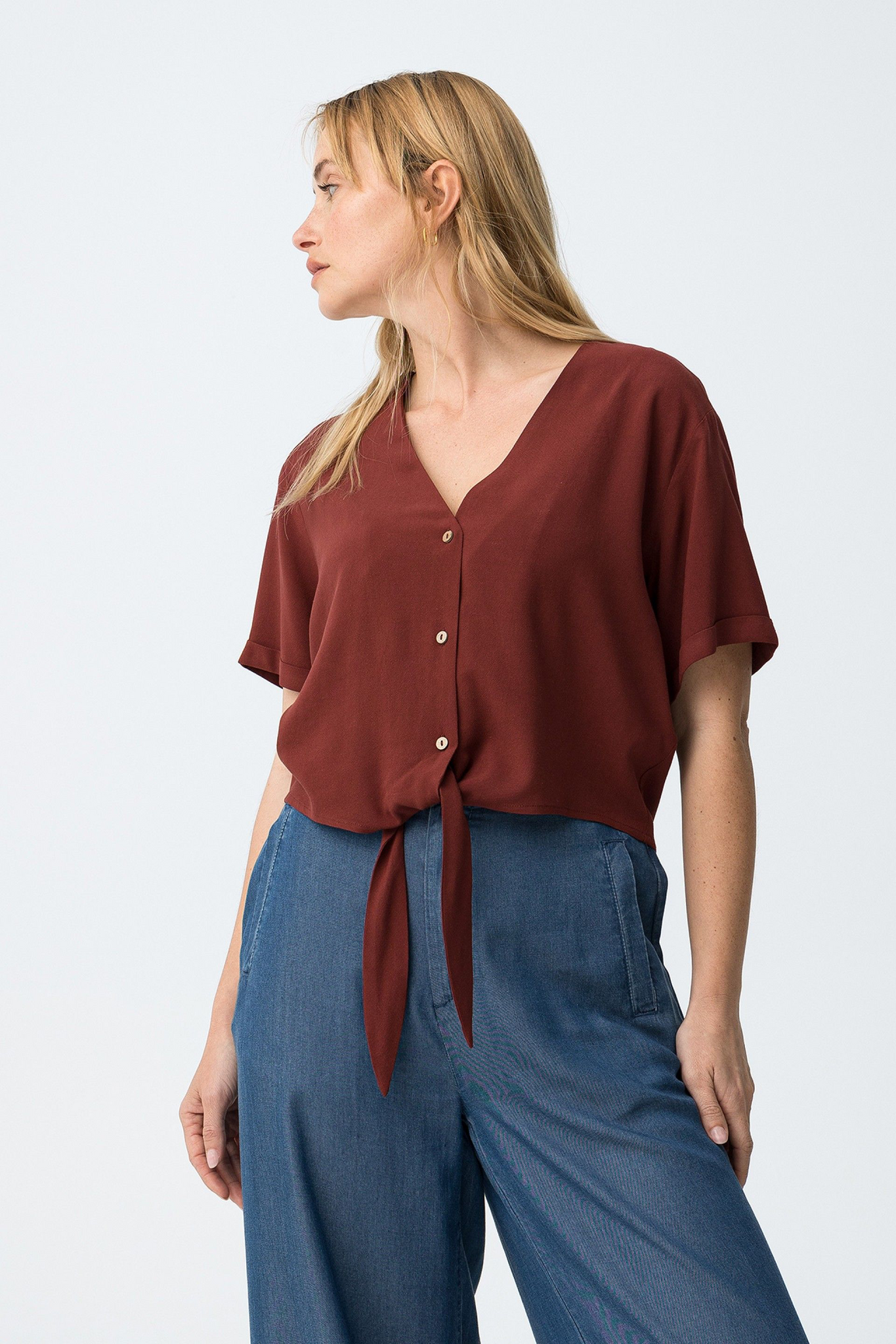 Camisa de manga corta en rojo oscuro, corte suelto, con botones y lazo delantero en la cintura.85% VISCOSE 15% LINEN