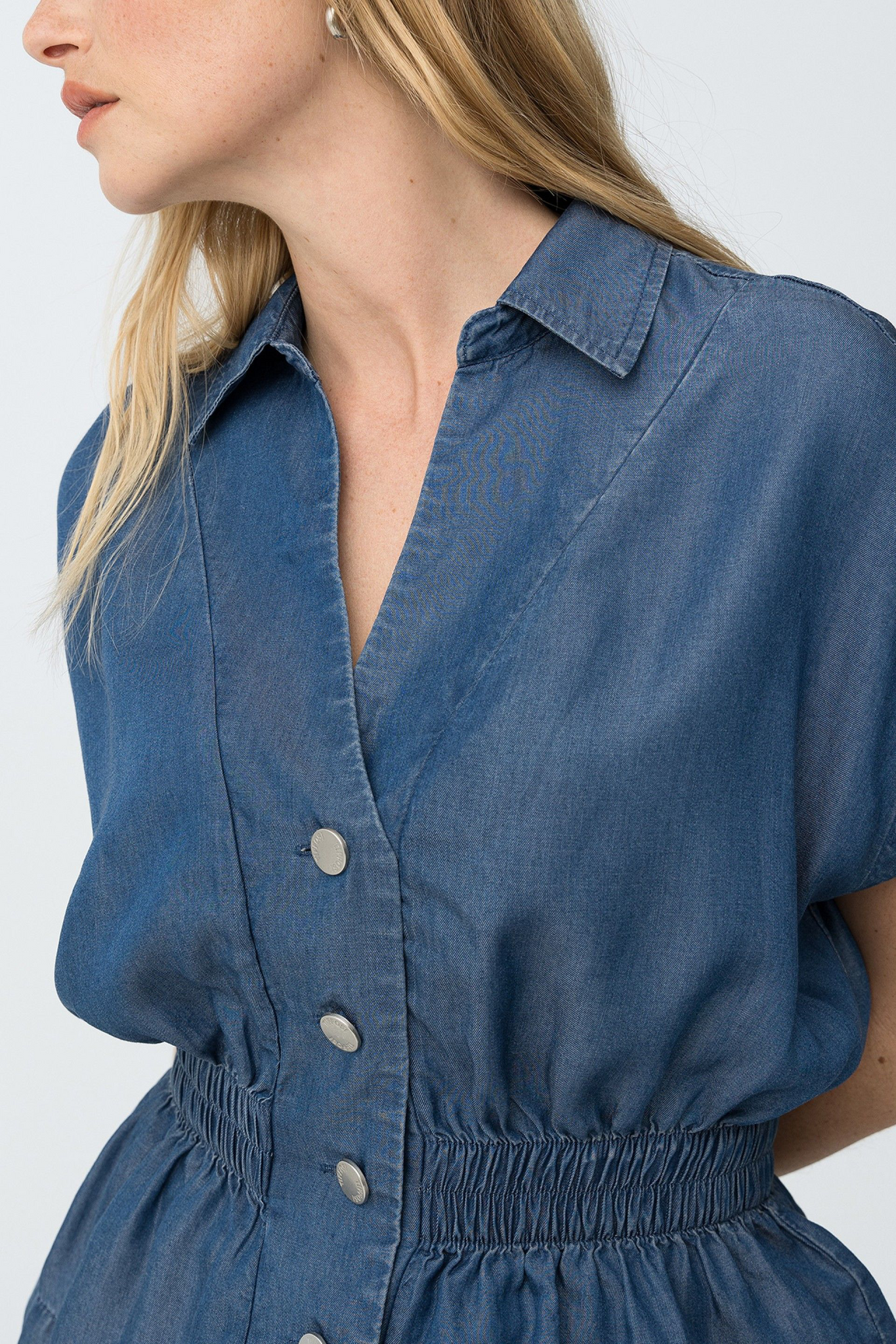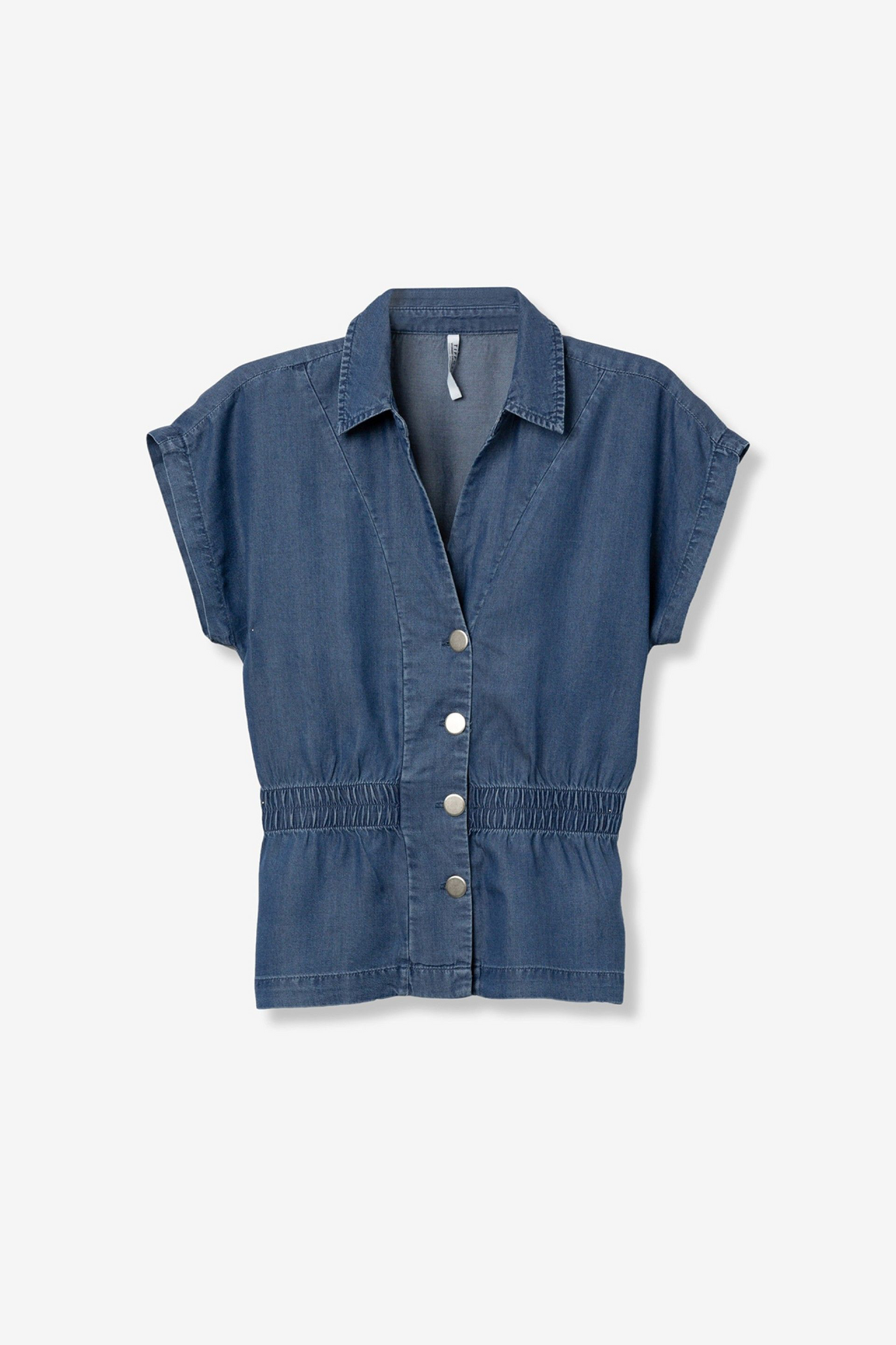 Camisa en azul oscuro con manga corta amplia, cintura elástica fruncida y cierre de botones metálicos.100% LYOCELL