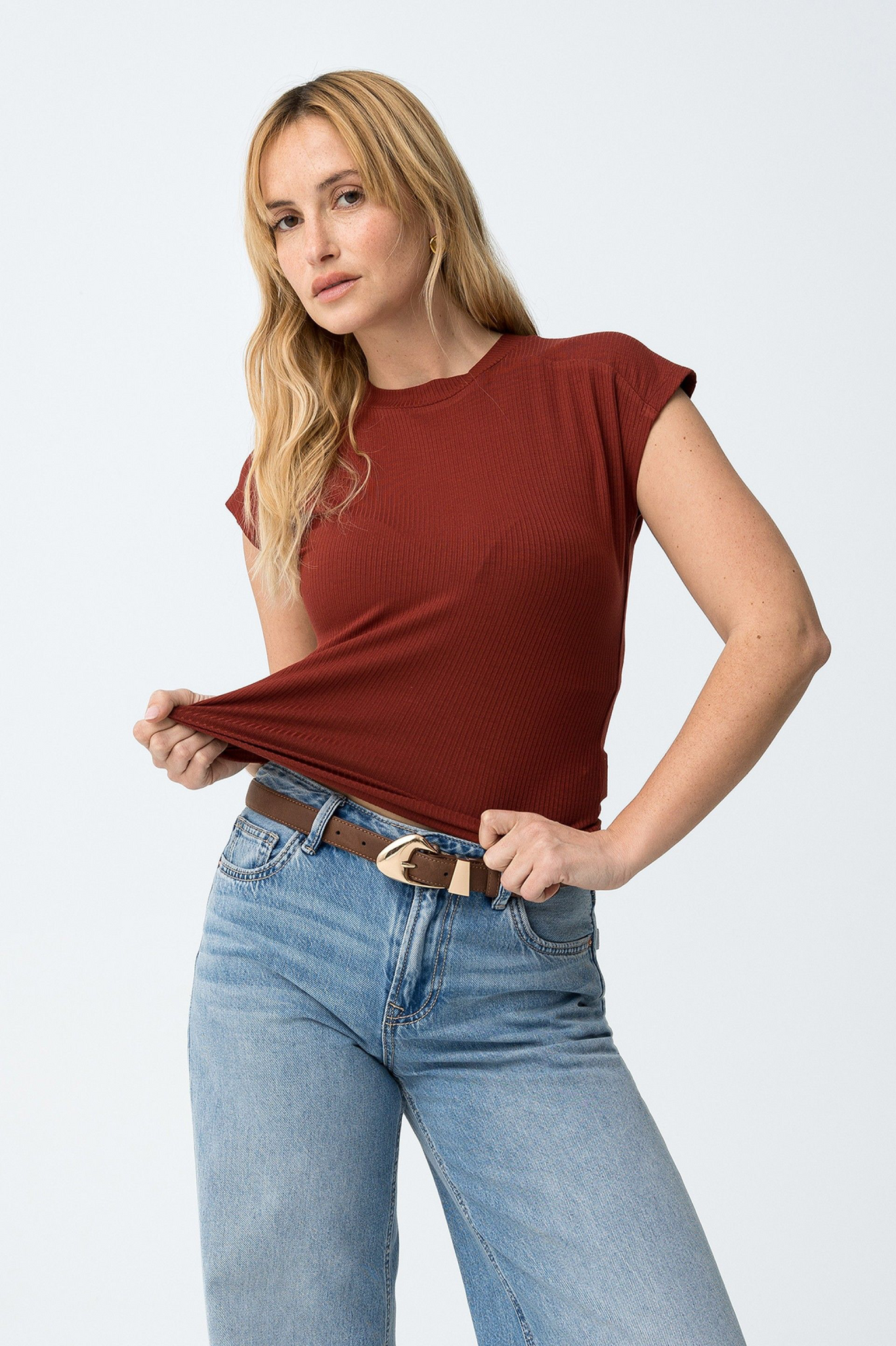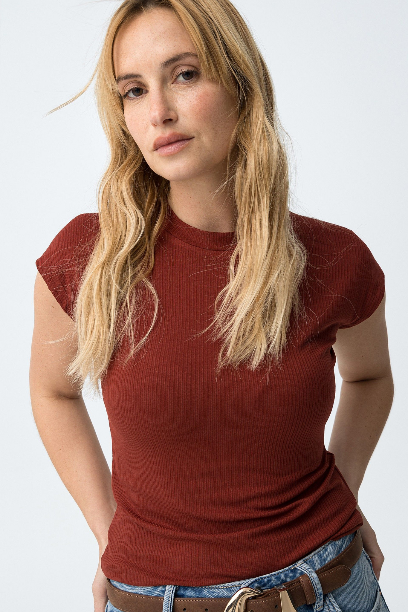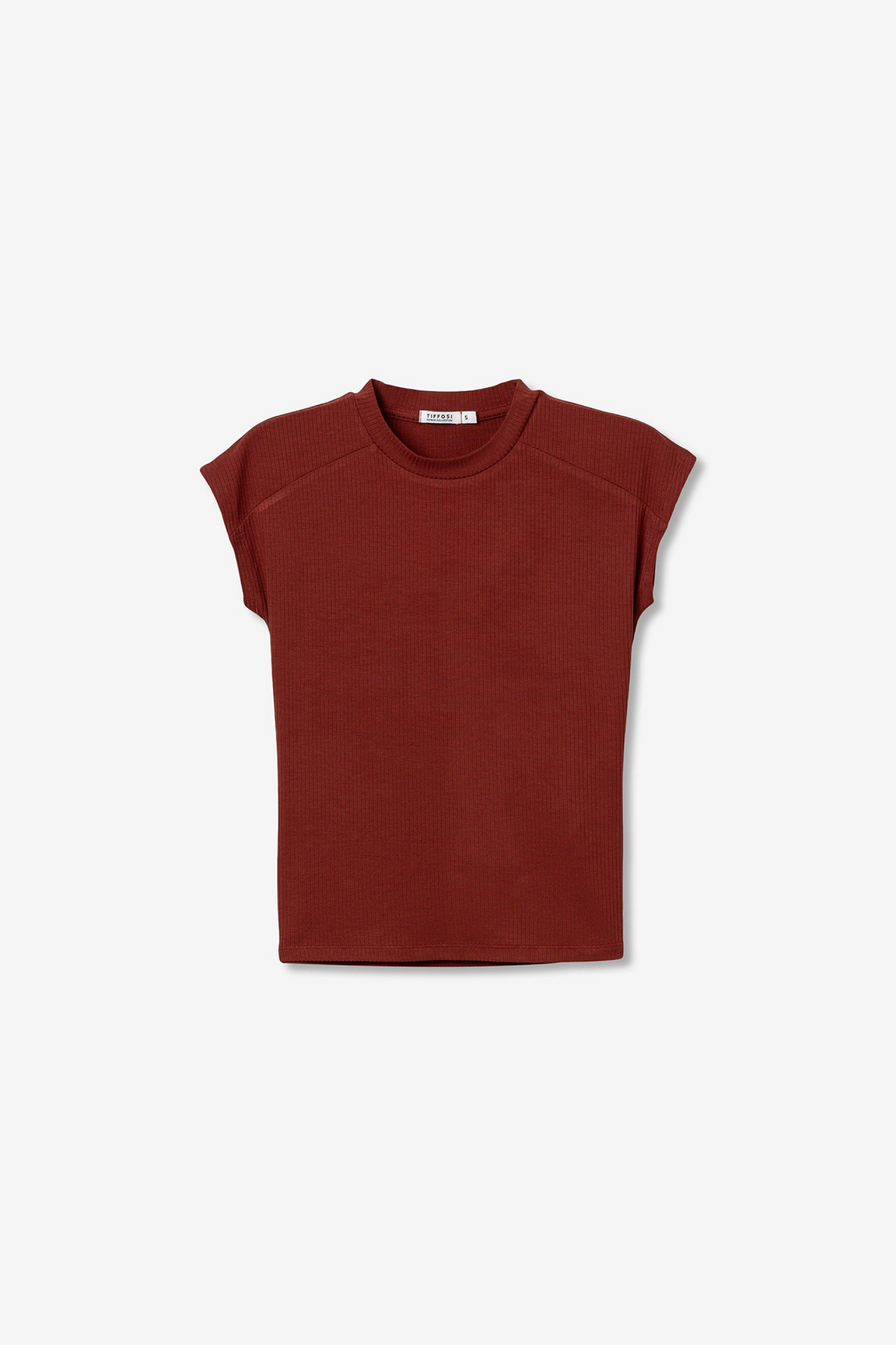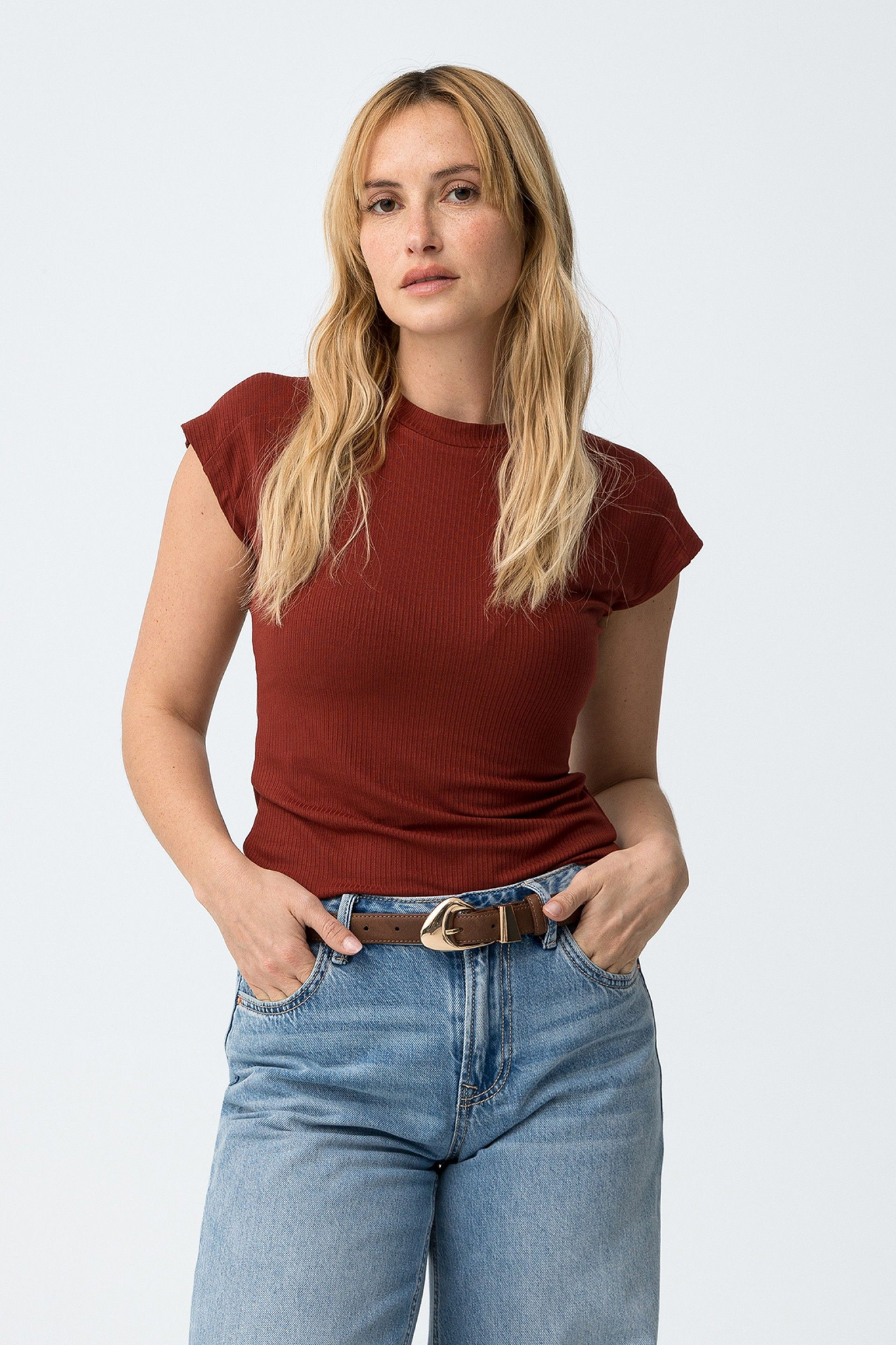 Top de manga sisa y cuello cerrado. Estrecho de canalé . Color caldera.