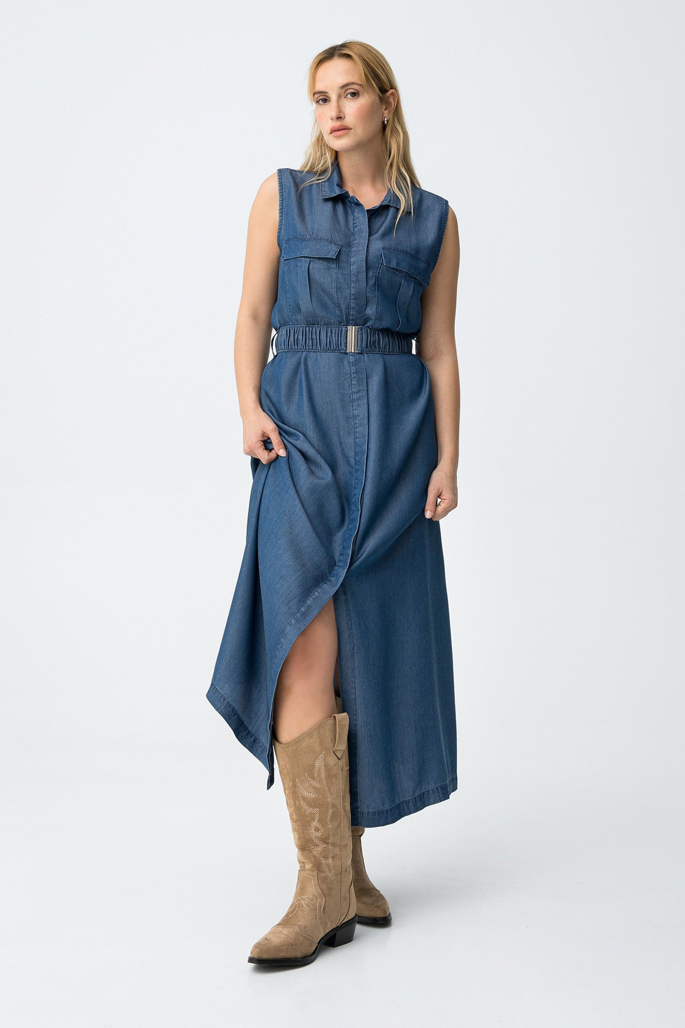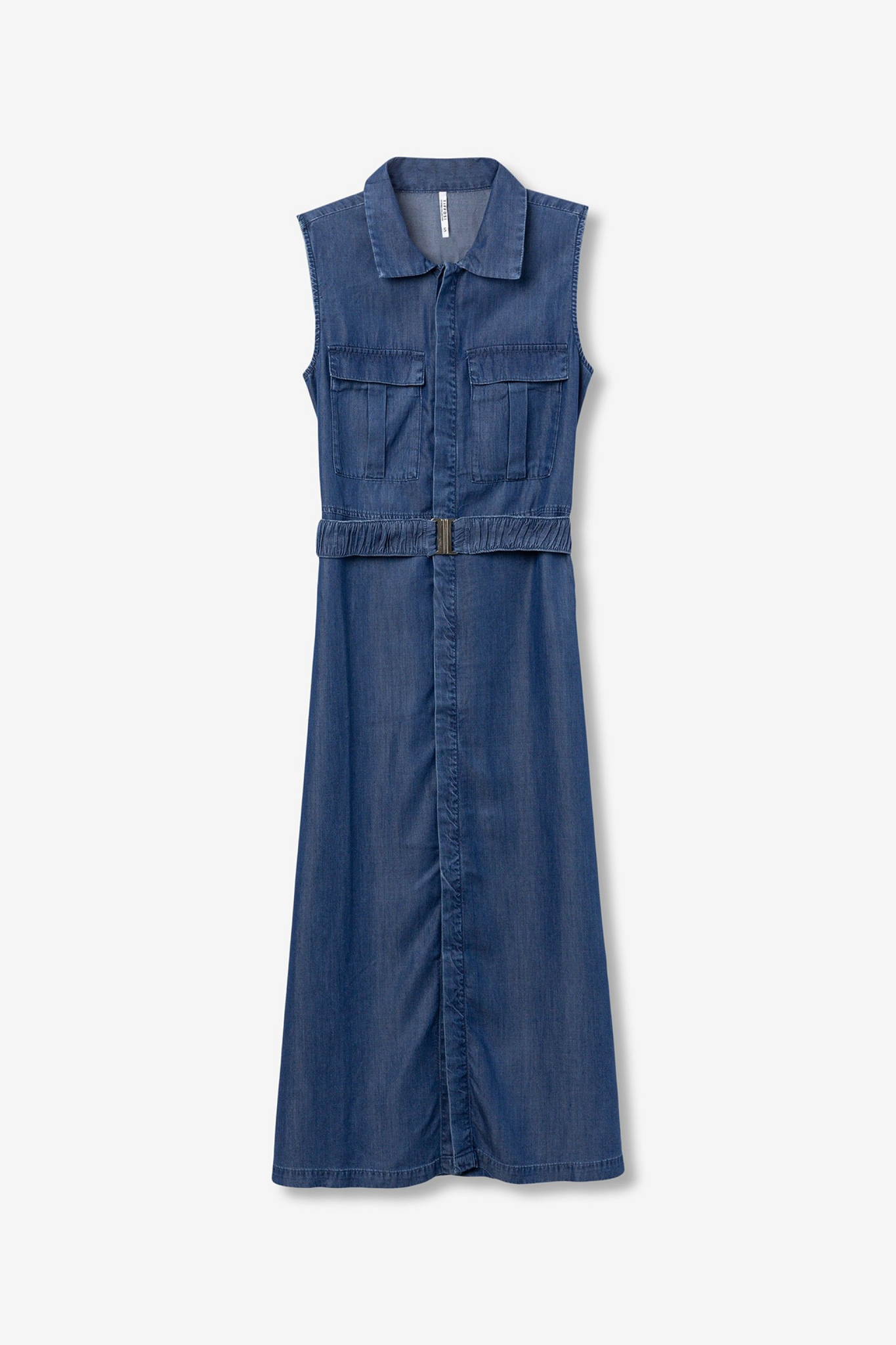 Vestido sin mangas en azul oscuro, corte recto, bolsillos delanteros, cinturón y cuello camisero.100% LYOCELL