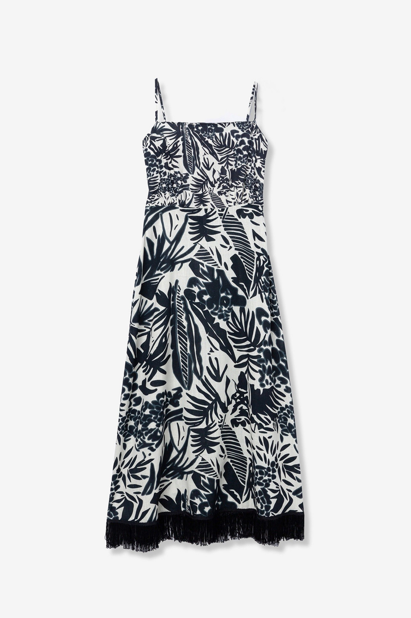 Vestido largo de tirantes con estampado tropical en azul oscuro y detalle de flecos en el bajo.85% VISCOSE 15% LINEN