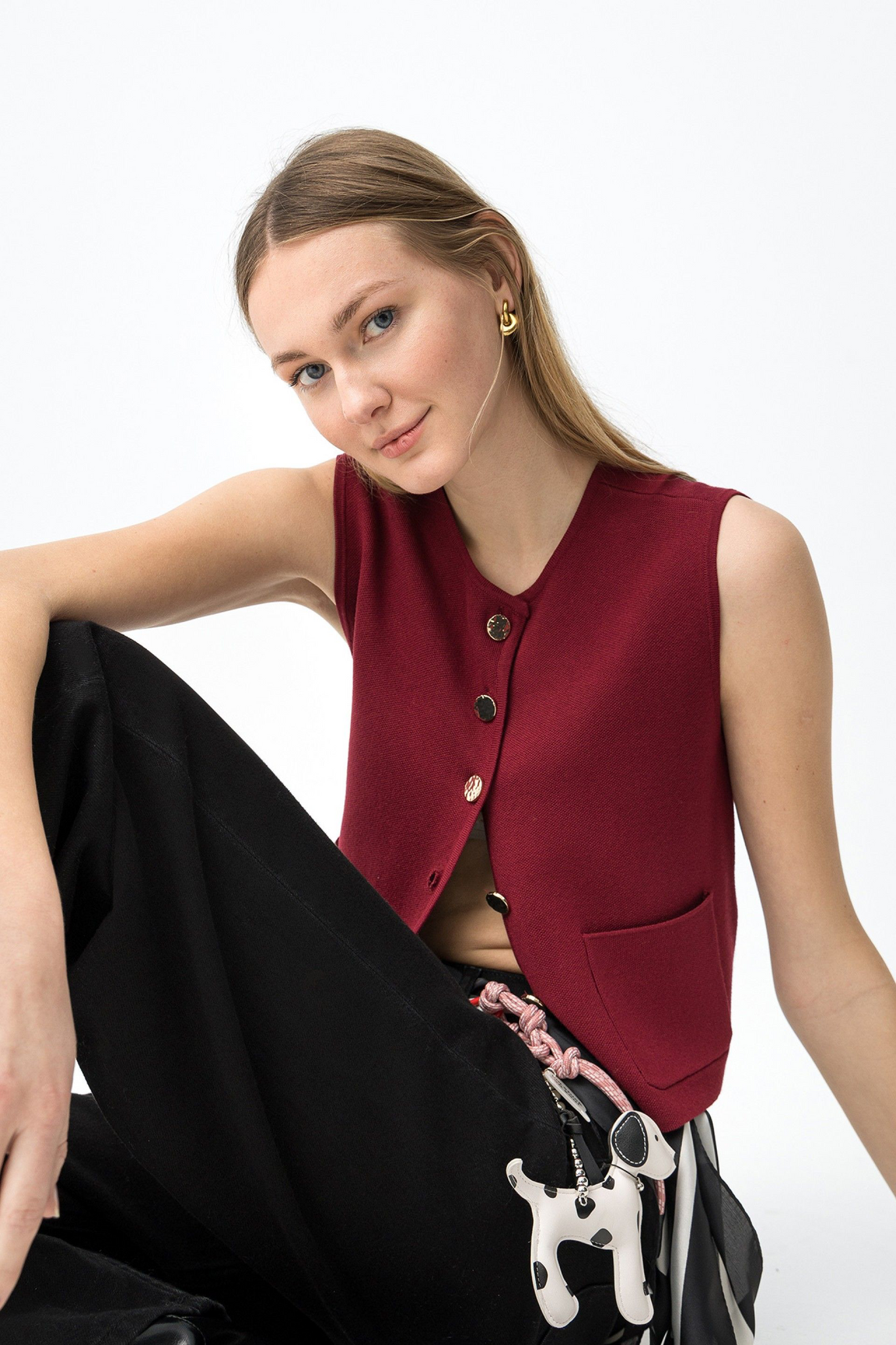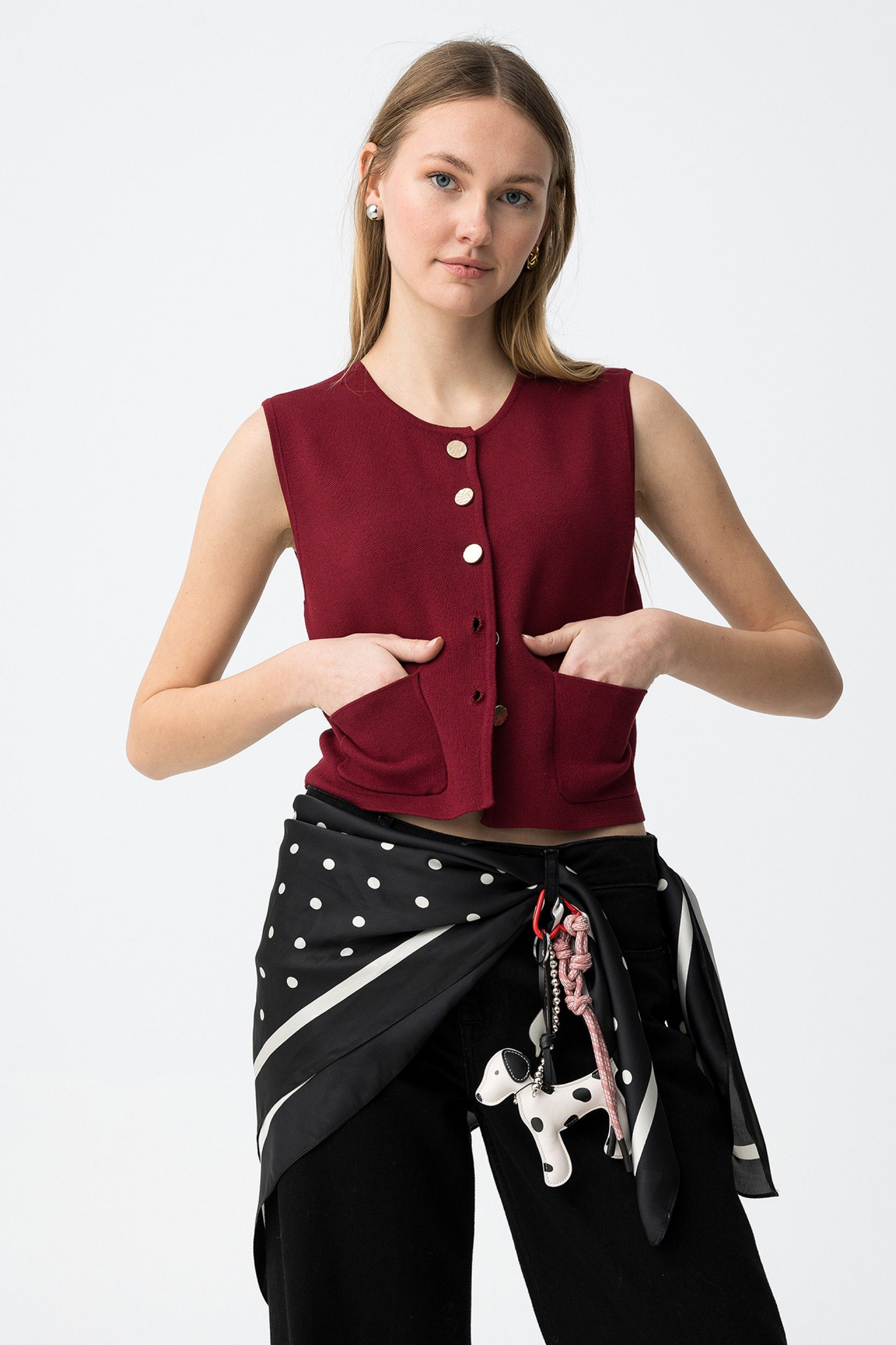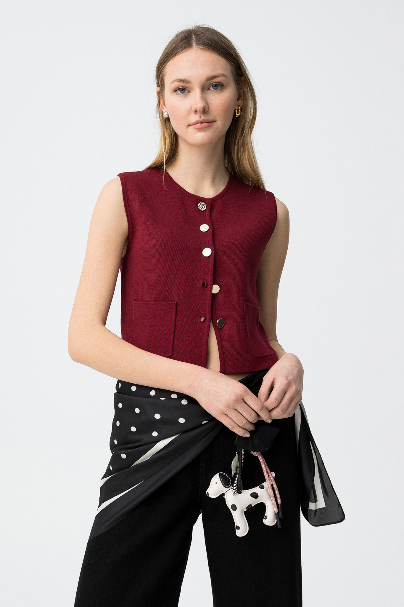 Chaleco de punto con bolsillos frontales. Detalle de botones dorados frontales. Ideal con nuestra falda HALLOW.