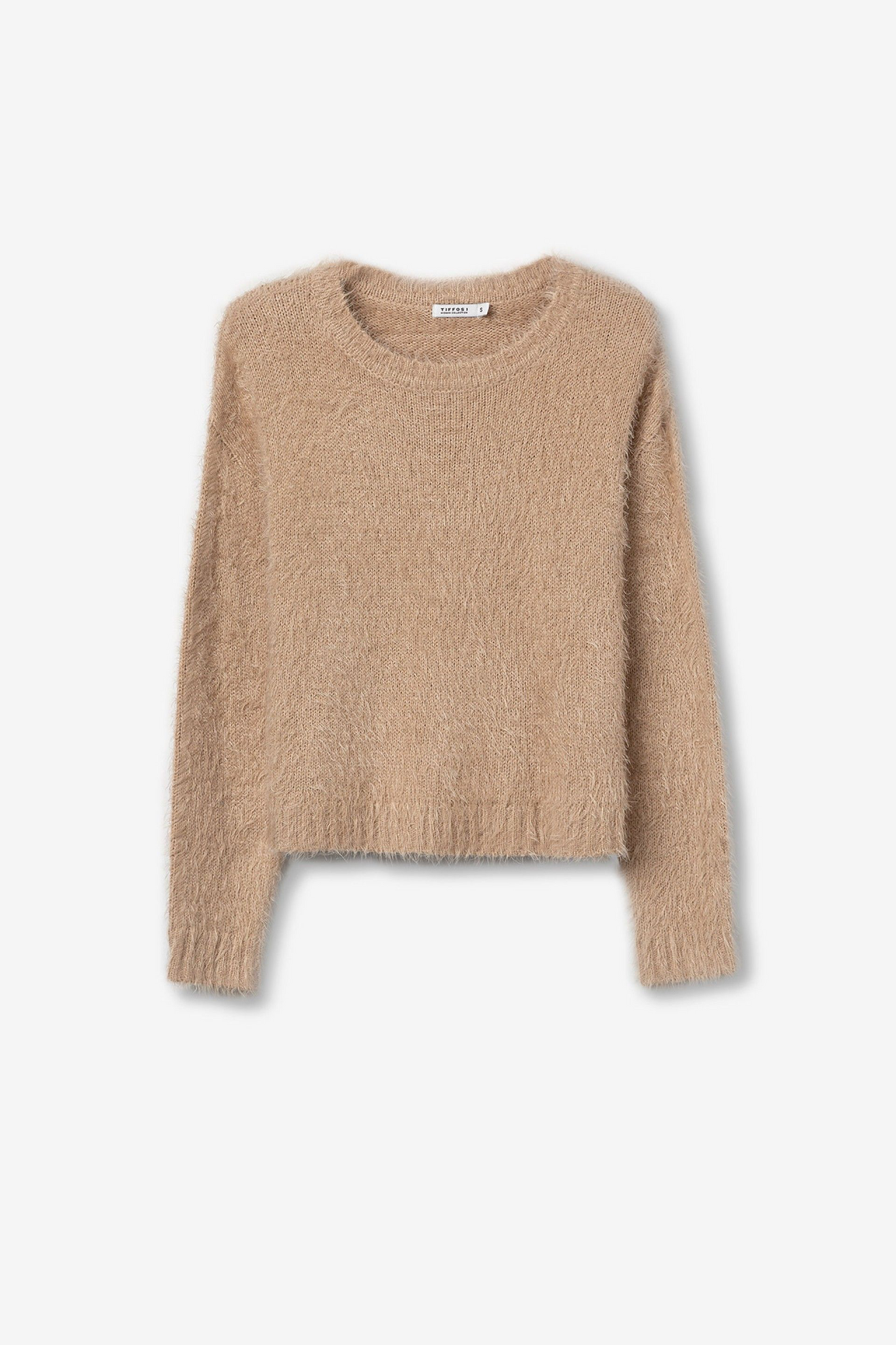 Camisola de punto felpudo en beige, corte regular, cuello redondo y mangas largas.