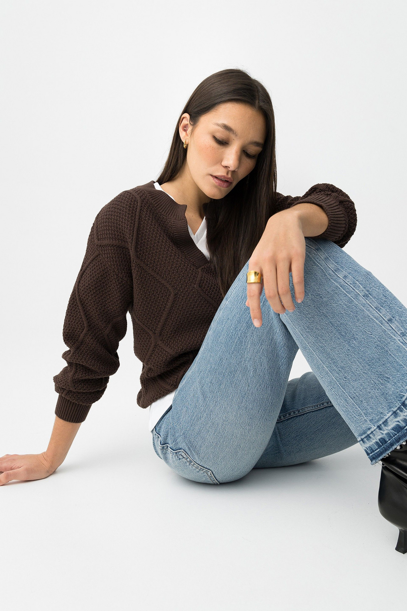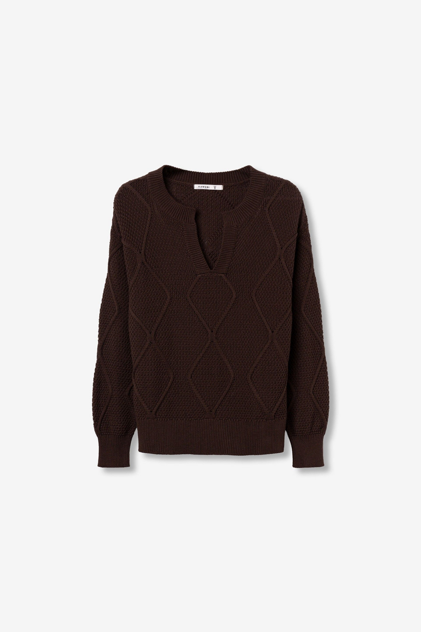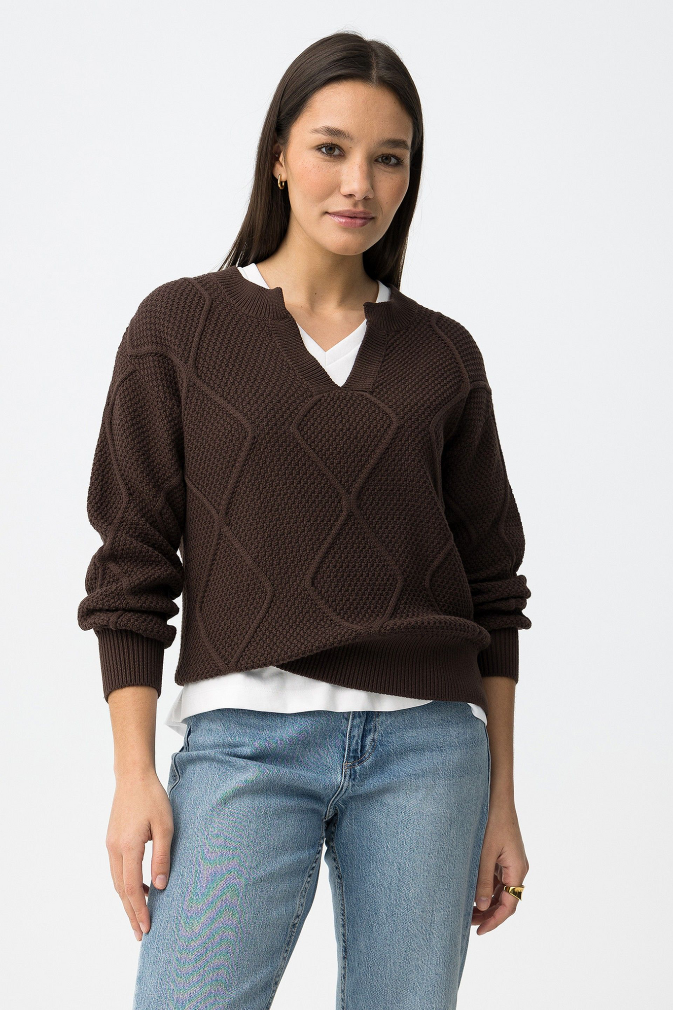 Camisola de tricotado en color chocolate, corte regular, manga larga y diseño geométrico en relieve.100% COTTON
