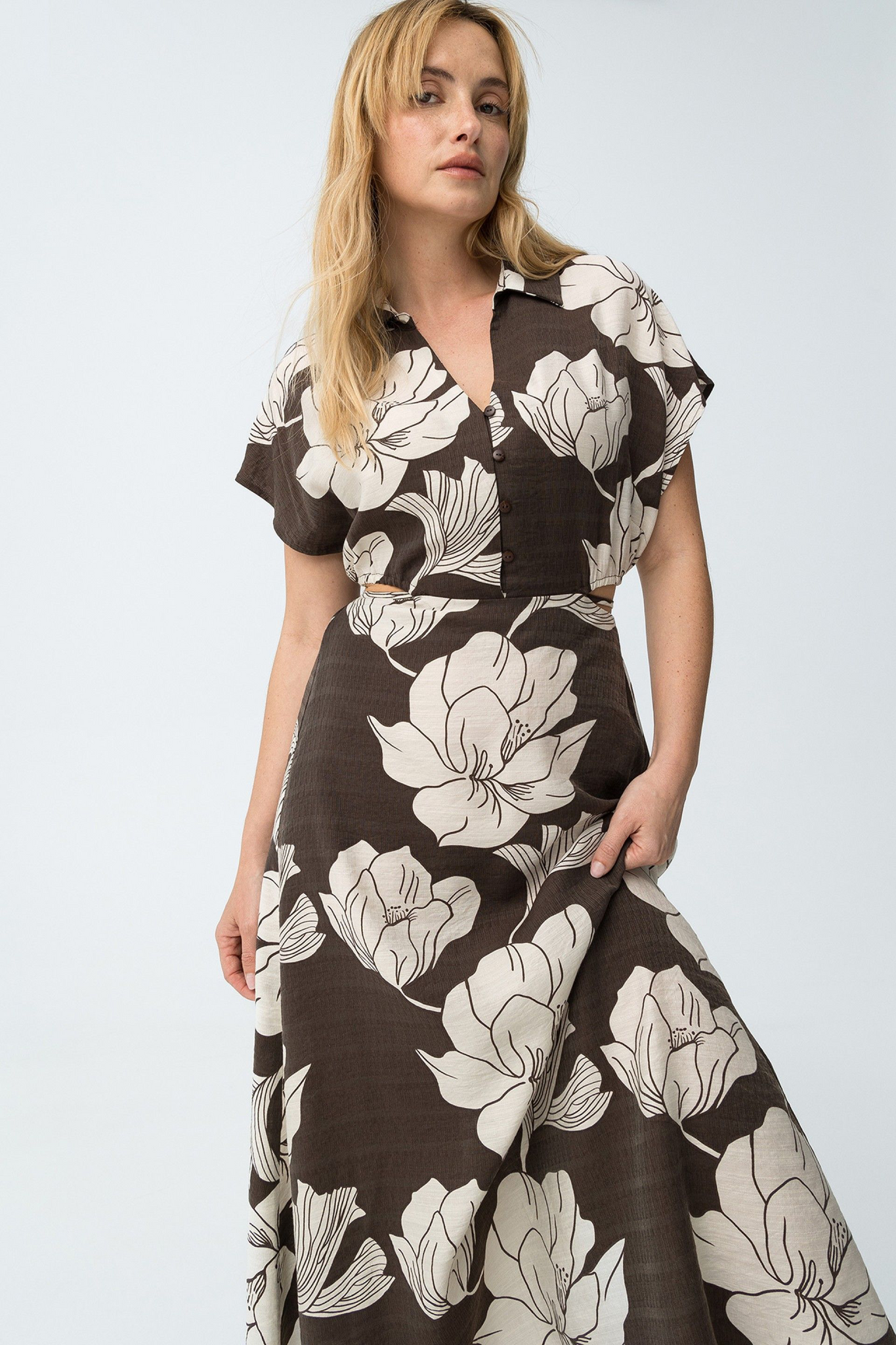 Vestido midi, con abertura lateral y trasera. Estampado floral en tonos beige y fondo chocolate.