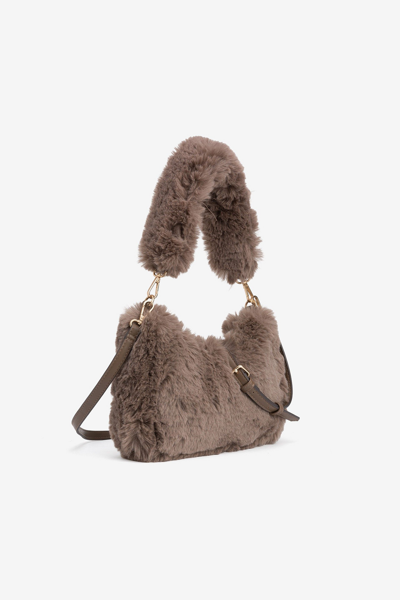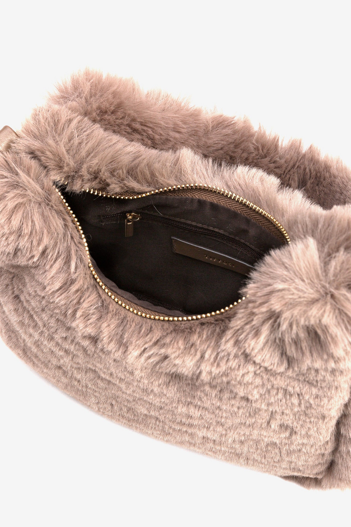 Bolso baguette de efecto peluche con cierre de cremallera superior. Asa de hombro desmontable y correa bandolera ajustable y extraíble.