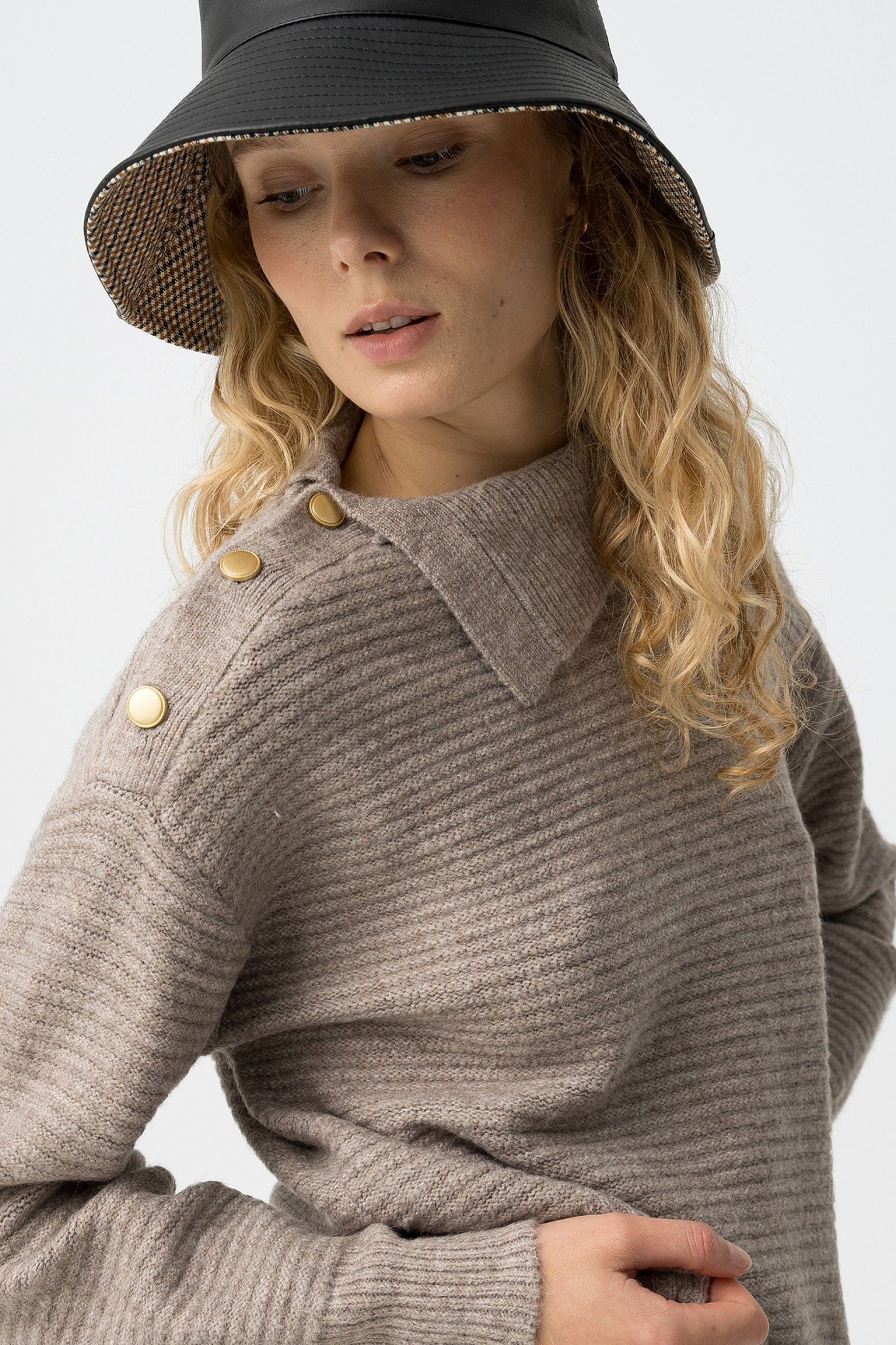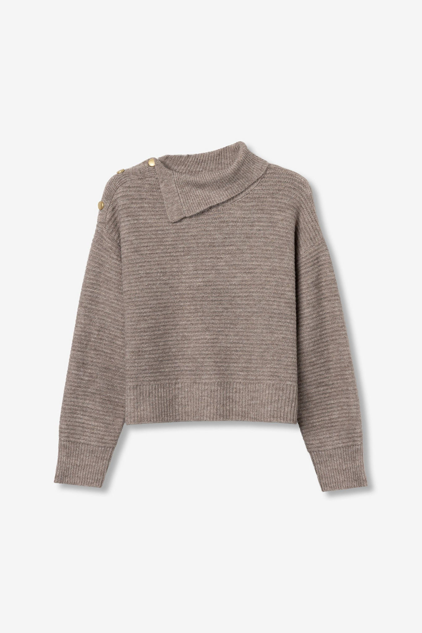 Jersey de punto con cuello vuelto detalle de botones doradas en el hombro. Color tostado. Queda ideal con la falda Manhattan.
