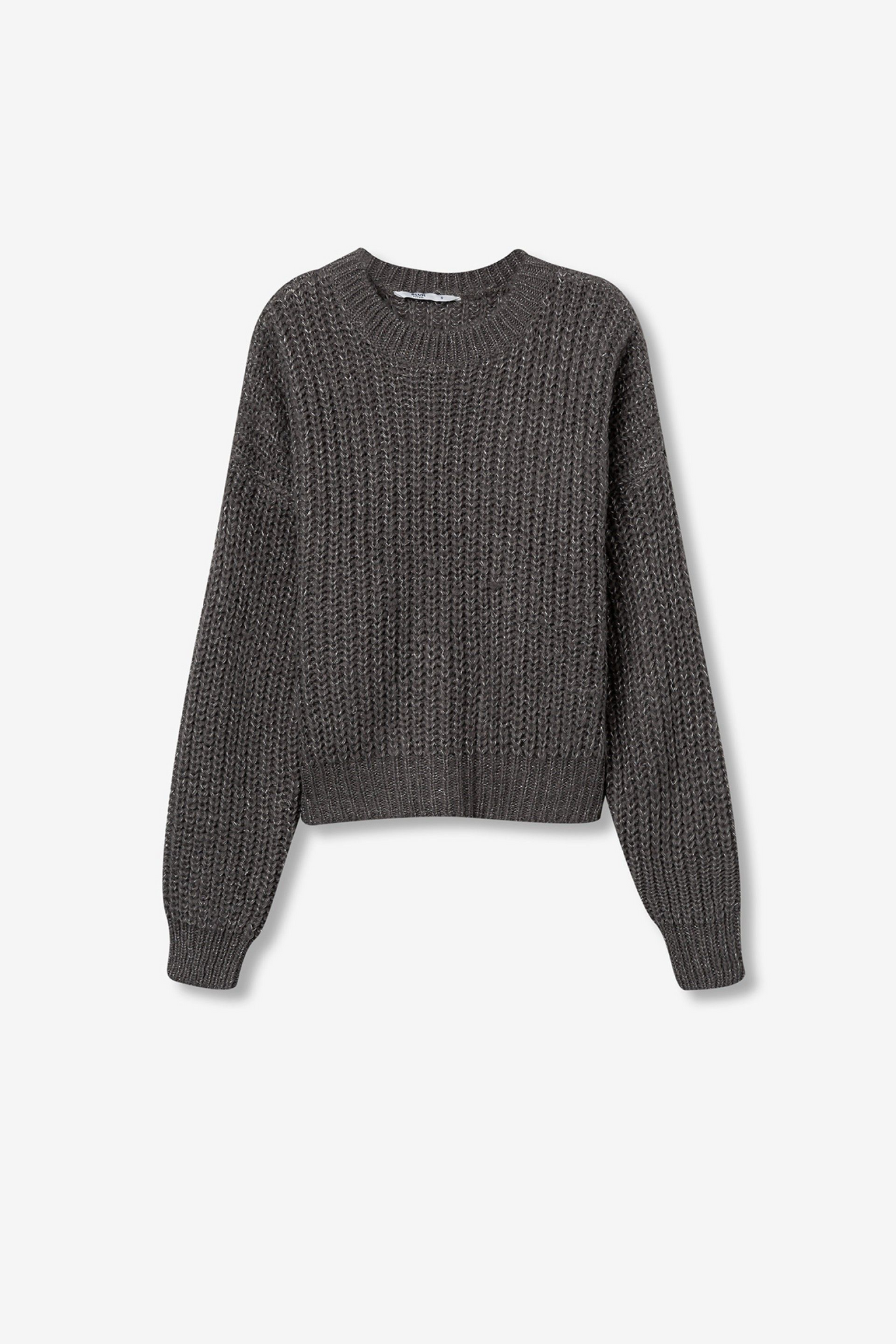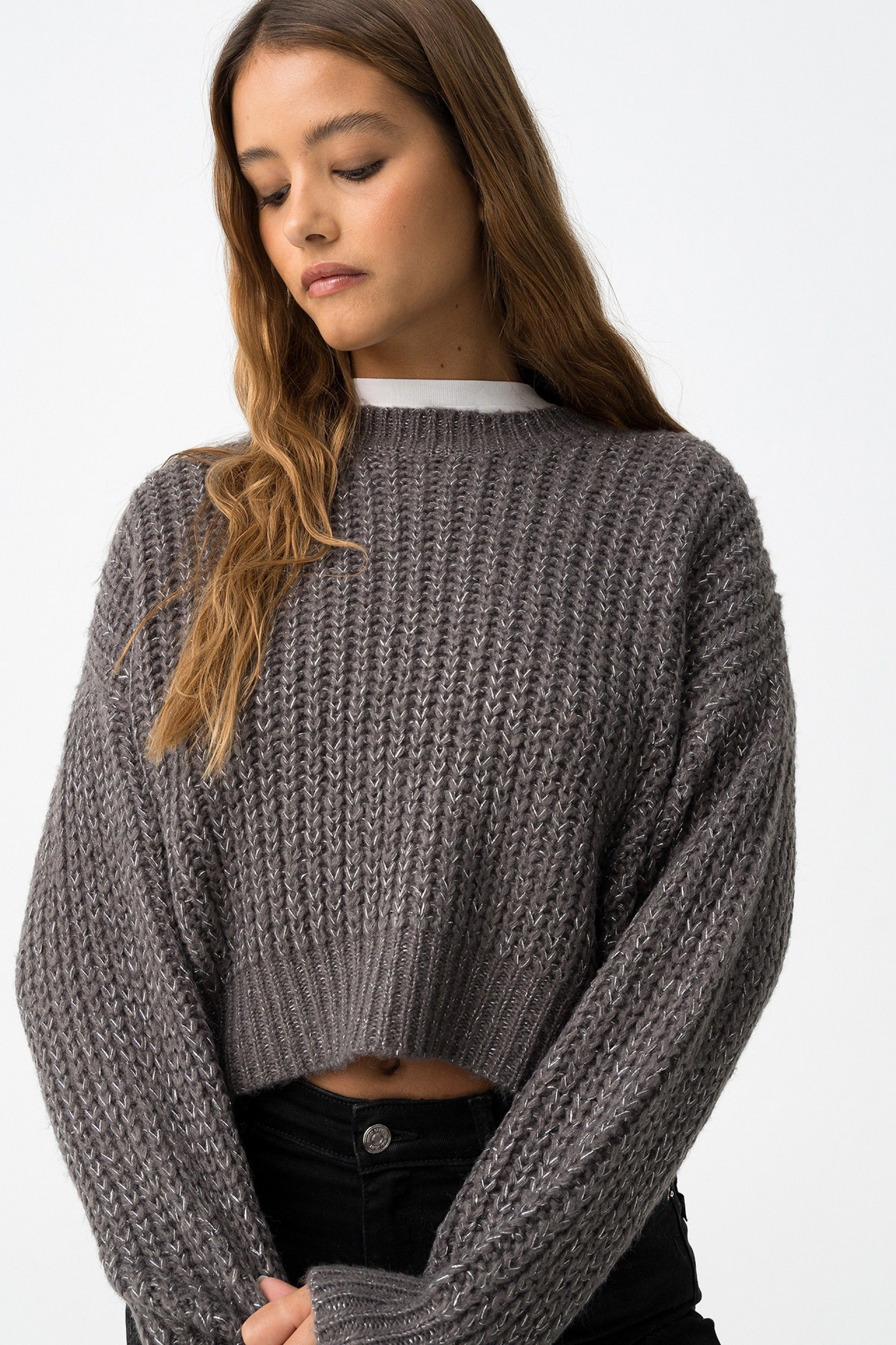 Jersey oversized de punto con hilo metálico insertado, escote redondo, manga larga y bajo cropped.