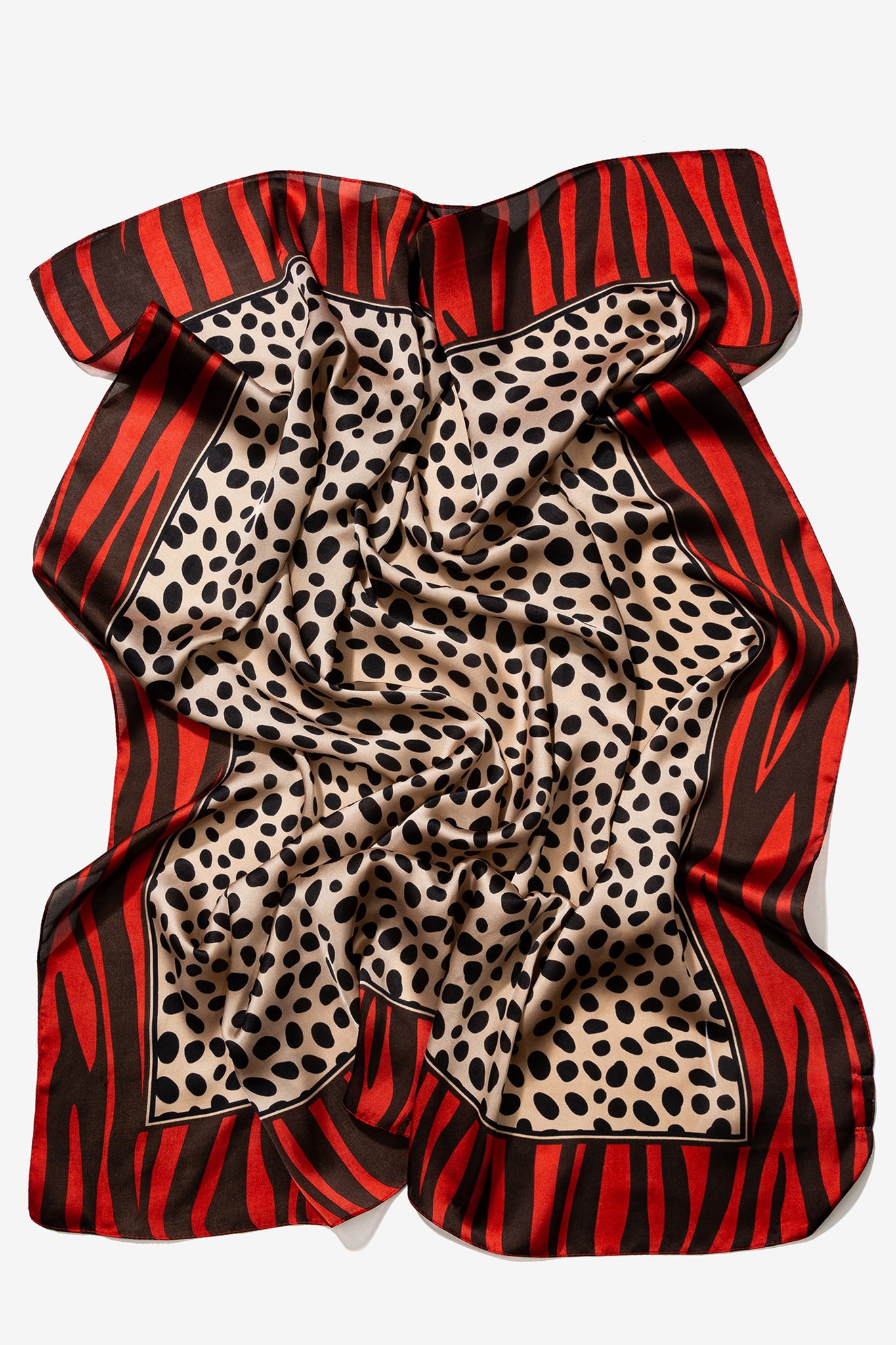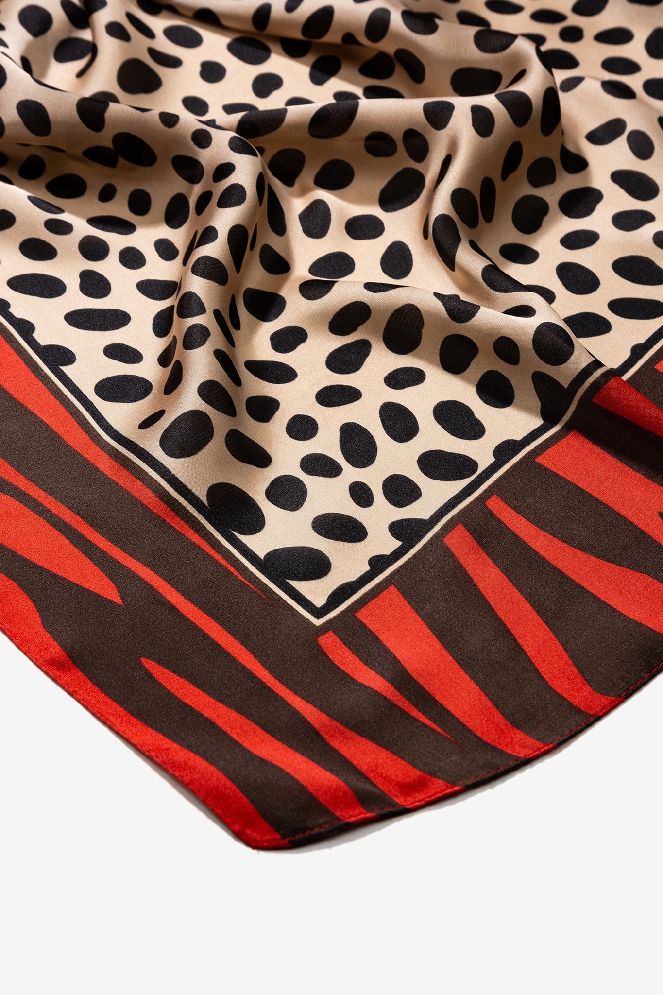 Pañuelo cuadrado sedoso. Estampado de topos en beige y negro, con detalle de recuadro en animal print rojo y negro.